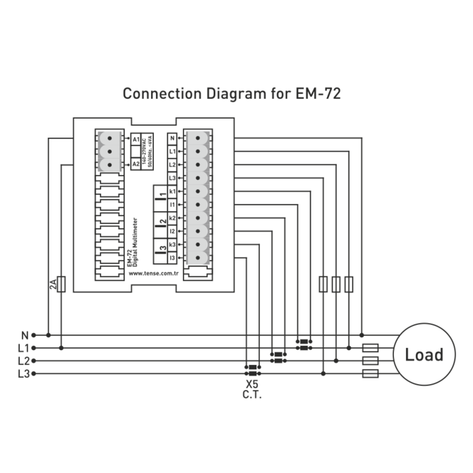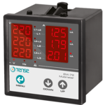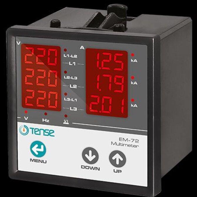 Multimetr - panelový multimetr 3-fázový, multifunkční digitální panelový měřič, ukazatel proudu, napětí a frekvence, výrobce TENSE (Turecko), panelové měřičeTřífázový VAHz panelový měřič střídavého proudu pro měření proudu, napětí a kontrolu zapojení fází v třífázových zařízeních, strojích nebo rozvodech střídavého proudu.Hlavní výhody: (I,U(L-L,L-N,HZ); Rozsah měření: (EM-06 a EM-72), nepřímé měření 5/5...9995/5A (EM-06 a EM-72), 1A - 100A (EM-100D) , 2-250A (EM-250D); Napětí - 1V-300V AC (L-N), 1V-500V AC (L-L); frekvence - 40Hz-60Hz; Sledování fáze; Měřicí transformátor je součástí dodávky (EM-100D a EM-250D). Obvykle se tento multimetr (EM-06/EM-72) používá s měřicími transformátory proudu - 60/5 75/5 100/5 150/5 200/5 250/5 300/5 400/5 500/5 600/5 800/5 1000/5 1500/5 nebo podobnými. Takové transformátory můžete zakoupit v našem e-shopu,