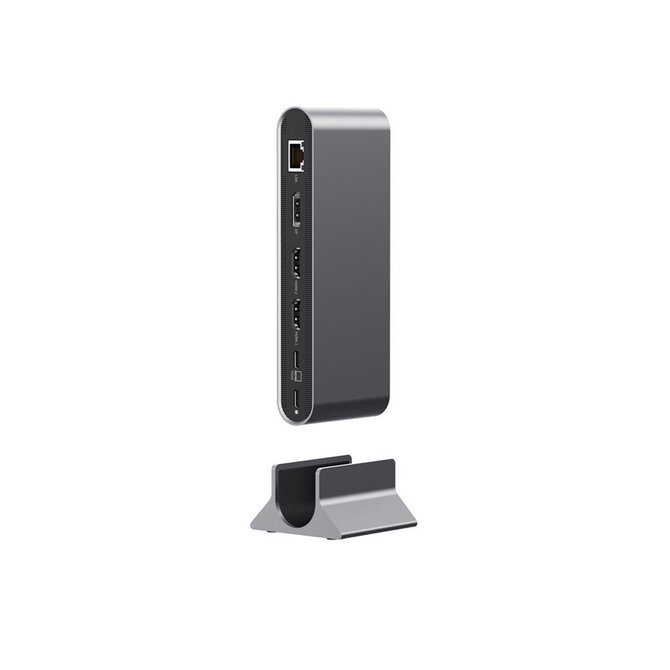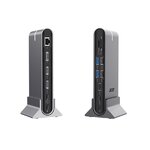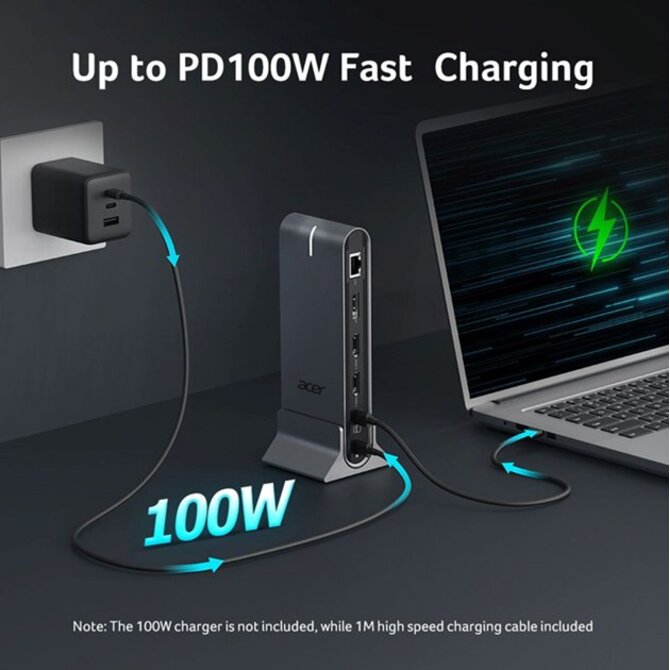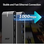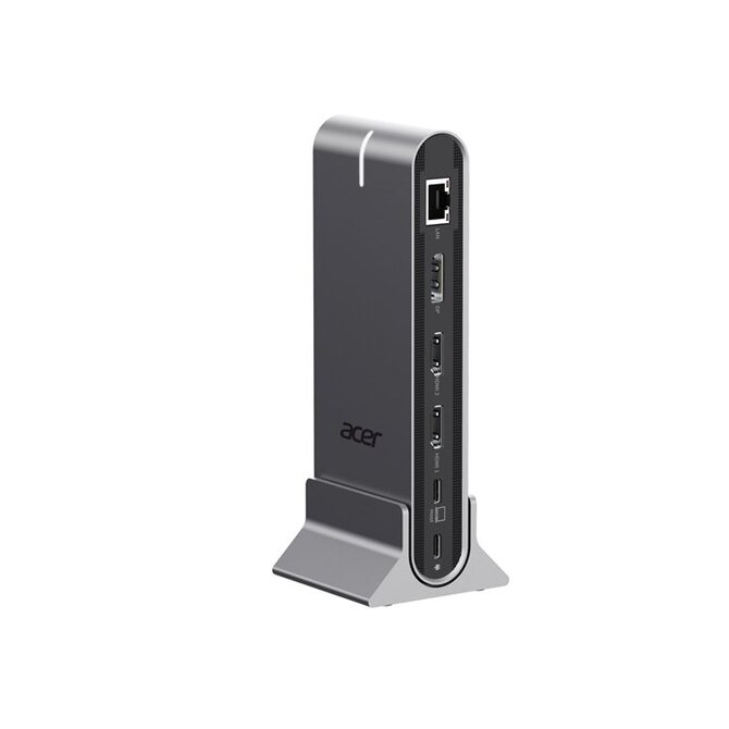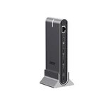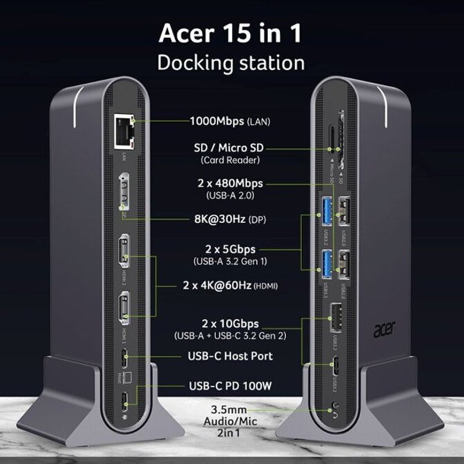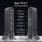 Acer 15in1 USB Type-C Universal Mini-dock: Host interface: USB-C, 2x USB-A 2.0, 1x USB-A 3.2 Gen2, 1x USB-A 3.2 Gen1, 1x USB-C Gen1, 1x USB-C Gen2, 2x HDMI (4K@60Hz max), 1x Display port (8k@30Hz max), 1x RJ-45 1 Gb/s, 1x 3.5 mm combo audio jack, 1x SD 3.0, 1x micro SD1x micro SD, Power delivery: up to 100 W (No adapter included), rozměry: 162 x 60 x 60 mm, hmotnost 300 g, stojánek, Dark Grey color