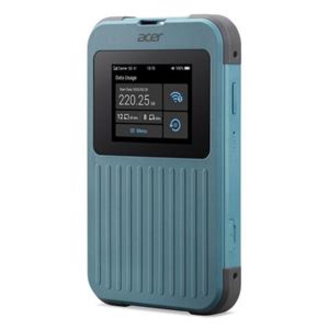 Acer Connect M4 5G - 5G<E dual connectivity mobile WiFi hotspot router, NanoSIM + eSIM + VirtualSIM (SIMO - 1GB data for free), 2,4" Color Touch displej, Mediatek Octa Core Cortex A78/A55 2.4GHz, paměť 3GB LPDDR4X, úložiště 8GB eMMC, Wifi 6 802.11 a/b/g/n/ac/ax 2x2 MIMO AX1200 pro až 16 zařízení, Dual band 2.4GHz + 5GHz nebo 2.4GHz + 6GHz, battery 8000 mAh (fast charging), Power Bank funkce, 1x USB Type-C 3.0 (USB-C kabel v balení), odolnost IP68, certifikace MIL-STD 810H, rozměry 140 x 86 x 19,1 mm, hmotnost 295g, modrozelený, bez adaptéru (doporučený: USB-C 10-15W 5V 3A)