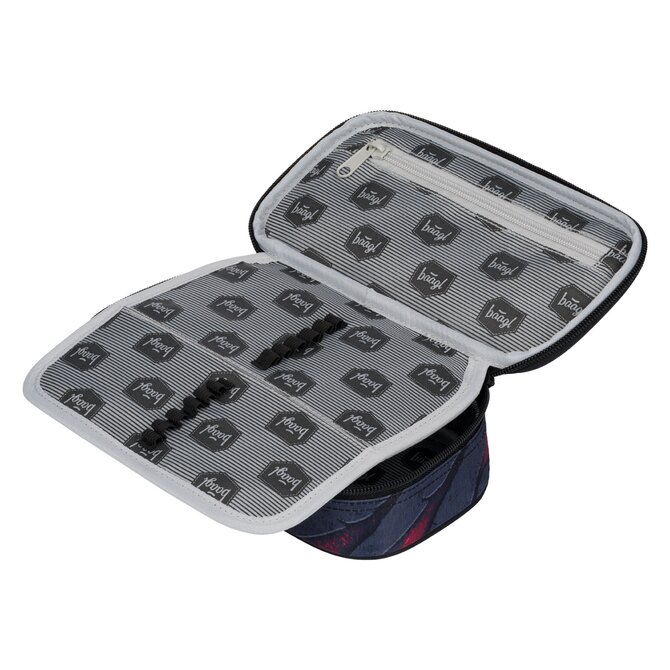 Stylový penál na zip české značky Baagl černý s logem Baagl a potiskem. Penál je opatřen dvojitou výklopnou chlopní, uvnitř je kapsa na zip a také kapsa pro rozvrh školních hodin. Nechte vykročit vaše dítě vstříc školním lavicím stylově.