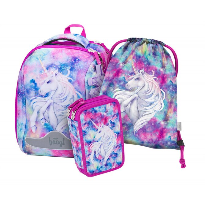 Duhově barevný dívčí školní set značky Baagl série Shelly s motivem Jednorožce, je vhodný pro dívky od 1. - 2. třídy ZŠ. Tento set obsahuje batoh, sáček na obuv a praktický penál.