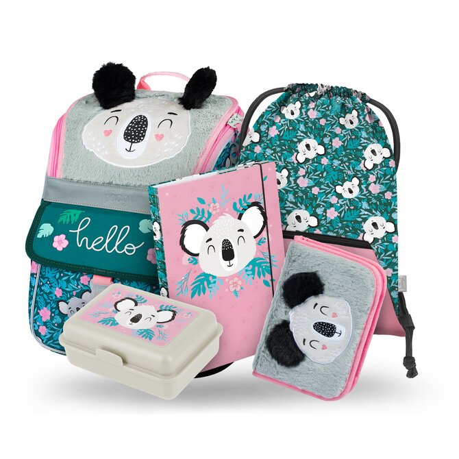 Velký školní set české značky Baagl v zelené barvě složený z aktovky, penálu, sáčku na obuv, boxu na svačinu a desek na školní sešity s motivem koaly.