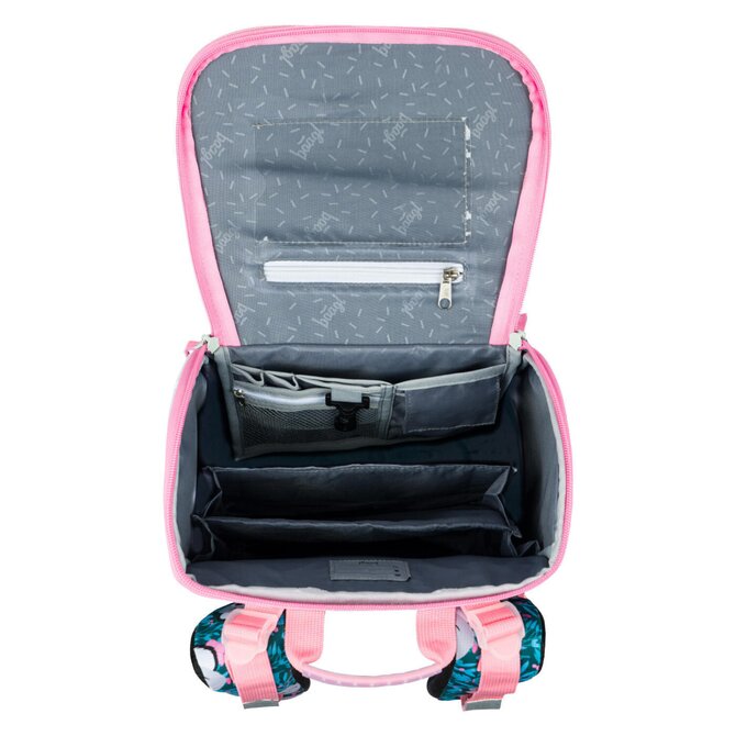 • Uvnitř aktovky je průhledná kapsa na rozvhr a vnitřní organizér umožňující rovnoměrné rozložení hmotnosti, doplněný gumičkou pro fixaci.