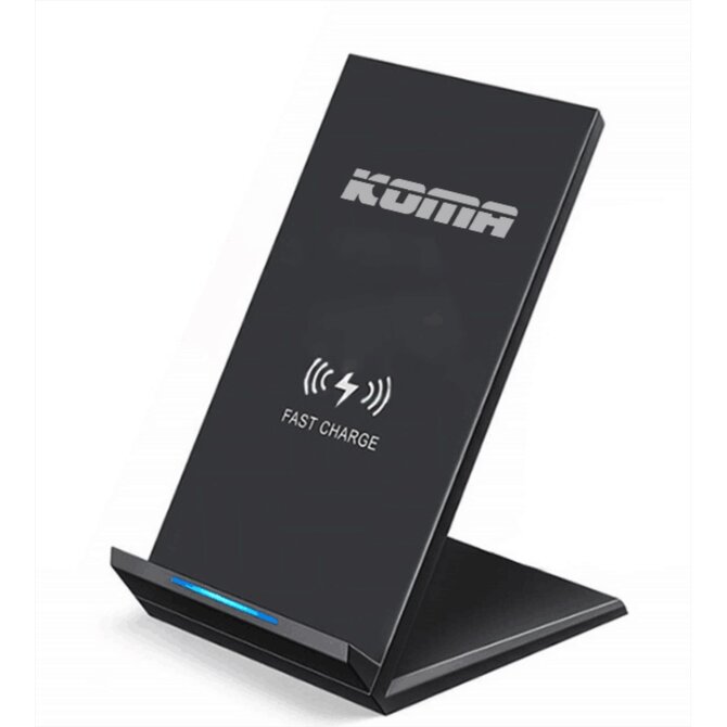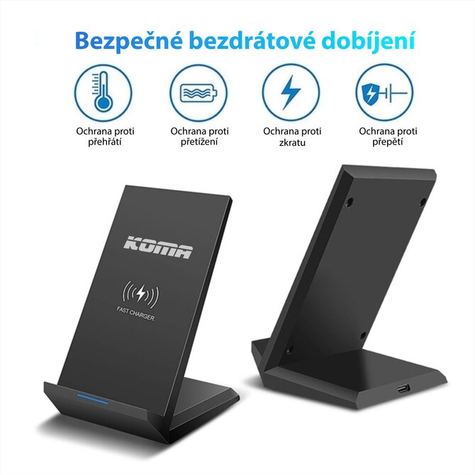 Bezdrátová nabíječka KOMA WFC01 má dvě cívky (DualCoil) a splňuje certifikaci Qi. Součástí balení je také USB-C kabel. Nabíječka nabíjí výkony 5 W, 7,5 W a 10 W. Střední výkon o hodnotě 7,5 W je vhodný pro zařízení Apple.Tím, že je dvoucívková umožňuje nabíjení ve vertikální i horizontální poloze.Je vybavena čtyřnásobnou bezpečnostní ochranou nebo také inteligentní detekcí cizích objektů, která při detekování předmětu jako například mince, karty apod. okamžitě přerušuje nabíjení, čímž zabrání poškození telefonu nebo nabíječky.