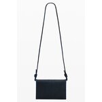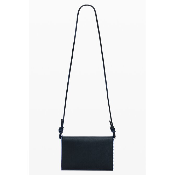 Peněženka s nastavitelným popruhem ve stylu kabelky, zipem, přihrádkami na karty, bočním prošitím a vyrytým kovovým logem.