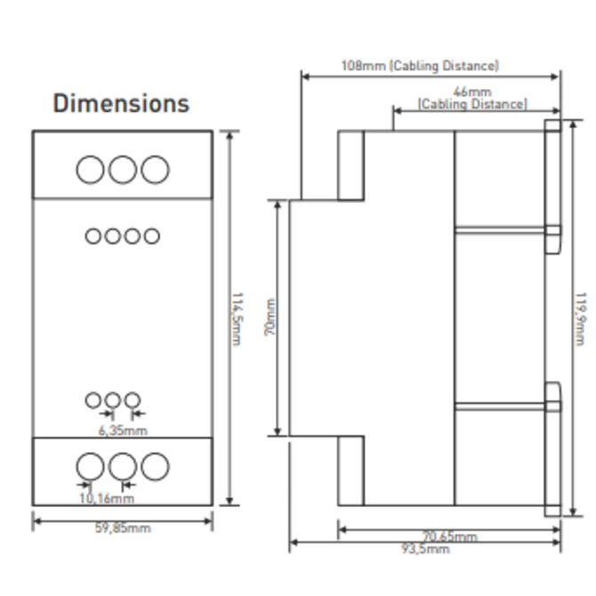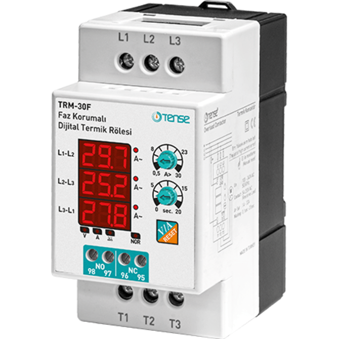 Monitorovací nadproudové relé TRM-30F s displejem, 3-fázové do 25A Je určeno k ochraně zařízení citlivých na hodnoty provozního proudu a napětí před chybami, které mohou vzniknout v důsledku: proudového přetížení (nastavitelná hodnota proudu 0,5 … 30 A) asymetrie proudu (50 %, pevná hodnota) asymetrie napětí (30 %, pevná hodnota) přepětí a podpětí (Umin: 265 V, Umax: 440 V, pevná hodnota) Digitální nadproudové relé přetížení TRM-30F s displejem umožňuje zobrazit aktuální proud v každé fázi a chránit motor nebo spotřebič proti nadproudu, přepětí, podproudu, výpadku fáze a změně pořadí fází. Tato digitální přetížovací relé jsou navržena tak, aby zabránila poškození motoru/zátěže vysokými proudy a zároveň umožnila kontrolu aktuálního proudu tekoucího v každé fázi na displeji. Také dokáží kontrolovat hodnoty sdruženého napětí mezi fázemi. Díky dvěma výstupním relé (1x NO, 1x NC) je možné také ovládat či odpojit zátěž při dosažení nastavené hodnoty nadproudu, nebo zapnout signalizační kontakt do řídicího systému. Digitální relé TRM-xx mají vestavěné proudové transformátory a 3x3-místný displej pro zobrazení proudu. Použití a princip činnosti Připojte zařízení podle připojovacího schématu. Nesprávné připojení může poškodit zařízení. Nastavte nadproud zařízení pomocí ovladače ">A" podle provozního proudu zátěže, kterou budete kontrolovat. Po připojení napájení se během první sekundy na horním displeji zobrazí nastavená hodnota nadproudu a na středním displeji čas čekání na chybu. Aktuální hodnoty proudů z fází se zobrazí po jedné sekundě provozu a rozsvítí se indikační LED. Po stisknutí tlačítka "V/A/RESET" se zobrazí hodnoty sdruženého napětí mezi fázemi. Ovladače "A>" – nastavení dovoleného přetížení; hodnota se zobrazuje na horním displeji. "sec." – nastavení času čekání na chybu nadproudu; hodnota se zobrazuje na středním displeji. Stav kontaktů NO 95-96, NC 97-98: Zařízení bez napětí nebo v chybovém stavu: NO rozepnutý, NC sepnutý. Zařízení pod napětím a bez chyb: NO sepnutý, NC rozepnutý. Indikační LED LED "V" – svítí při přepětí/podpětí nebo chybě asymetrie napětí. LED "A" – svítí při vysokém proudu nebo chybě proudové asymetrie. LED "XI" – svítí při nesprávném pořadí fází. LED "NOR" – svítí, když je zařízení pod napětím a systém je bez chyb. Funkce tlačítka "V/A/RESET" Reset: stisknutí na 3 sekundy vymaže chybu, LED „A“ zhasne, NO kontakt se sepne, NC kontakt se rozepne. V/A: krátké stisknutí přepíná zobrazení mezi hodnotami proudu a napětí. Ochrany a princip činnosti 1. Ochrana proti nadproudu (0,5–30 A): Vstup do chybového stavu: při překročení nastaveného nadproudu se čeká nastavený čas. Displej fáze bliká, LED „A“ svítí, NO rozepnutý, NC sepnutý, LED NOR zhasne. Opustění chybového stavu: proud pod nastavenou hodnotu, stisknutí resetu na 3 sekundy. 2. Ochrana proti asymetrii proudu: Vstup: rozdíl proudu mezi fázemi >50 %, čeká 3 sekundy, displej bliká, LED „A“ svítí. Opustění: rozdíl 440 V): Vstup: napětí >440 V, čeká 3 sekundy, displej bliká, LED „V“ svítí. Opustění: napětí