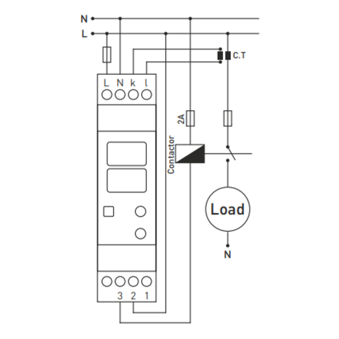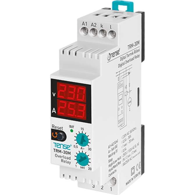 Monitorovací proudové a napěťové relé TRM-30M s displejem, 1-fázové do 30 A Jednofázové digitální relé určené k ochraně citlivých zařízení před nadproudem, přepětím a podpětím. Umožňuje přesné nastavení proudového limitu i časového zpoždění a zobrazuje měřené hodnoty napětí a proudu na dvouřádkovém displeji. TRM-30M je určeno na ochranu 1-fázových zařízení citlivých na hodnoty provozního proudu a napětí. Relé obsahuje v balení proudový transformátor a má následující funkce: Ochrana proti proudovému přetížení (nastavitelná hodnota proudu 0,5 … 30 A) Ochrana proti přepětí, napětí vyšší než 250 VAC (pevně nastavená hodnota) Ochrana proti podpětí, napětí nižší než 150 VAC (pevně nastavená hodnota) Hystereze napětí: 5 V (pevně nastavená hodnota) Zpoždění chyby napětí: 2 s (pevně nastavená hodnota) Reset chyby napětí: 2 s (pevně nastavená hodnota) Použití a princip činnosti Připojte zařízení podle přiloženého schématu zapojení. Nesprávné připojení může způsobit poškození zařízení. Nastavte hodnotu nadproudu podle provozních hodnot proudu zařízení, které budete používat. Po připojení napájení: Během první sekundy se na horním displeji zobrazí nastavená hodnota nadproudu. Na dolním displeji se zobrazí čas zpoždění chyby. Napětí mezi fází L a neutrálním vodičem N se zobrazuje na horním displeji. Proud odebíraný ze sítě se zobrazí na dolním displeji po jedné sekundě provozu. Nastavení A> – nastavení hodnoty nadproudu; hodnota se zobrazuje na horním displeji. sec. – nastavení času čekání před vstupem do chybového stavu nadproudu; hodnota se zobrazuje na dolním displeji. Po připojení napájení je sepnut NO kontakt a svítí kontrolka „OUT“. Když zařízení přejde do chybového stavu: Příslušný displej bliká LED „OUT“ zhasne NO kontakt se rozepne NC kontakt se sepne Ochranné funkce 1. Ochrana proti vysokému proudu – vstup do chybového stavu: Pokud proud odebíraný ze sítě přesáhne nastavenou hodnotu nadproudu, zařízení čeká nastavený čas zpoždění a poté přejde do chybového stavu. V chybovém stavu: NO kontakt rozepnutý, dolní displej bliká, LED „OUT“ zhasne, NC kontakt sepnutý. Výstup z chybového stavu: Pokud proud klesne pod nastavenou hodnotu, zařízení ukončí chybový stav po stisknutí tlačítka reset na 3 sekundy. V normálním provozu: NO kontakt sepnutý, dolní displej svítí stabilně, LED „OUT“ svítí, NC kontakt rozepnutý. 2. Ochrana proti přepětí (U > 250 V) – vstup: Při napětí nad 250 V čeká zařízení 2 sekundy a přejde do chybového stavu. V chybovém stavu: NO kontakt rozepnutý, horní displej bliká, LED „OUT“ zhasne, NC kontakt sepnutý. Výstup: Zařízení automaticky ukončí chybový stav 2 sekundy po poklesu napětí pod 245 V. Normální provoz: NO sepnutý, horní displej svítí stabilně, LED „OUT“ svítí, NC rozepnutý. 3. Ochrana proti podpětí (U < 150 V) – vstup: Při napětí pod 150 V čeká zařízení 2 sekundy a přejde do chybového stavu. V chybovém stavu: NO rozepnutý, horní displej bliká, LED „OUT“ zhasne, NC sepnutý. Výstup: Automatické ukončení chybového stavu 2 sekundy po zvýšení napětí nad 155 V. Normální provoz: NO sepnutý, horní displej svítí stabilně, LED „OUT“ svítí, NC rozepnutý. Signalizace chyb Horní displej bliká: při chybě vysokého nebo nízkého napětí. Dolní displej bliká: při chybě vysokého proudu. LED OUT: svítí, když je zařízení v normálním stavu. NO kontakt sepnutý. Stav zařízení Stav zařízení NO kontakt NC kontakt Zařízení bez napětí Rozepnutý Sepnutý Zařízení pod napětím, chyba Rozepnutý Sepnutý Zařízení pod napětím, bez chyby Sepnutý Rozepnutý