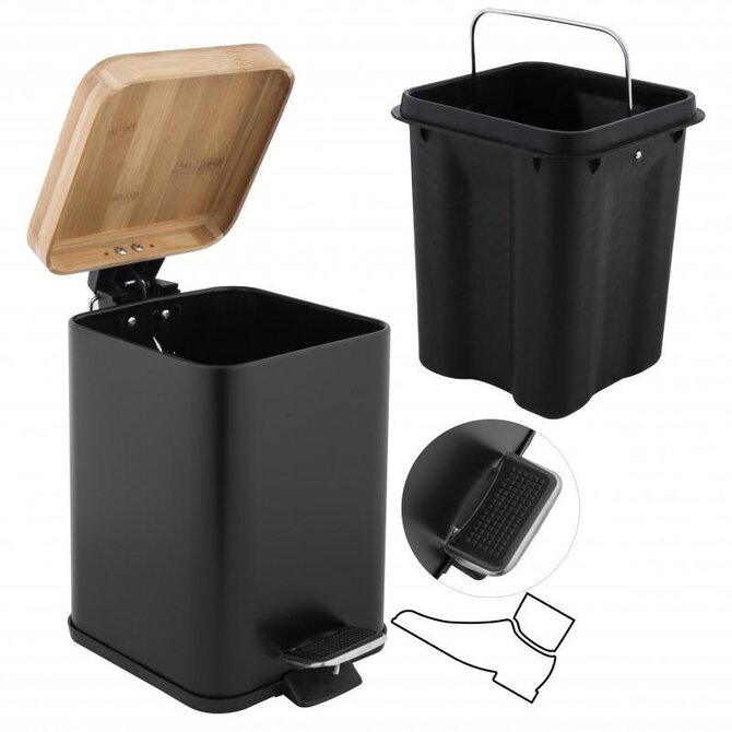 DuraHome Koš na odpadky, 3 l, čtverec, bambusové víko, LORETO 43945, černý