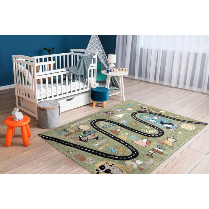 Dětský kusový koberec Fun Route Street animals green je zábavný koberec, který se hodí do všech dětských závodních pokojíčků. Během cestování se podél cesty objevují různá zvířátka. Koberec je vyrobený ze 100% polypropylenu s velmi jemným střiženým vlasem, ten zaručí nerušené hraní a žádná odřená kolena. Na výrobu nebyla použitá žádná toxická látka a tím výrobek je velmi vhodný i pro alergické děti. Koberec je po celém obvodě obšitý a je tak chráněn proti třepení.