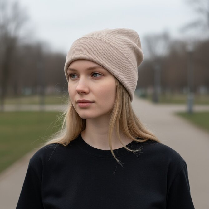 Ebbie Bavlněná čepice Beanie - LATTE - ŽEBROVANÁ Velikost: 54