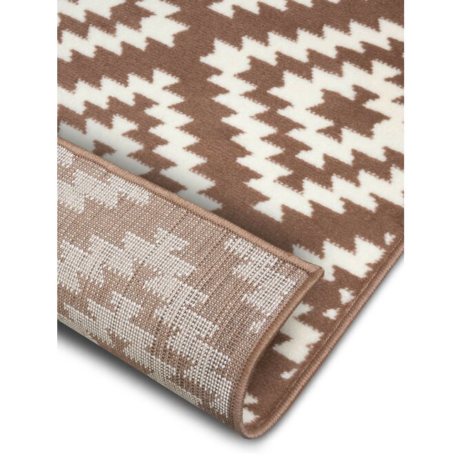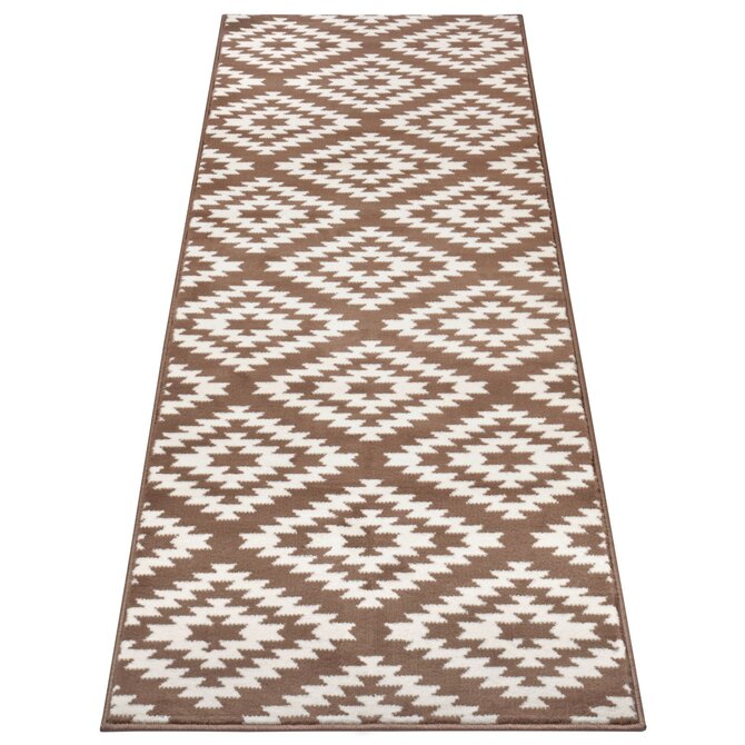 Bílý koberec s hnědými kosočtverci skvěle doplní každou chodbu nebo předsíň. Mezi jeho přednosti patří velice komfortní došlap, což zajišťuje středně vysoký střižený vlas. Vyrábí se z pevného polypropylenu, a proto je odolný a najde uplatnění i v zatěžovanějších prostorech.