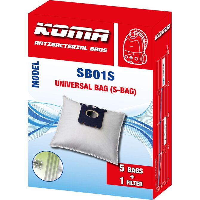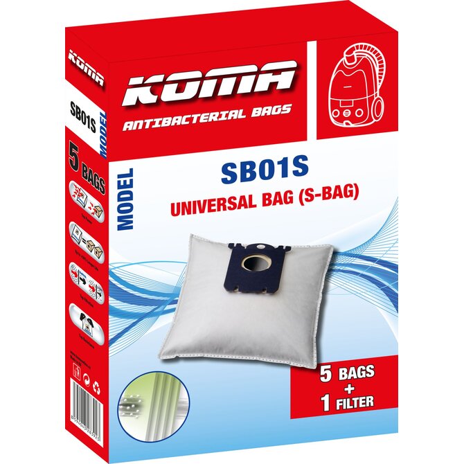 Sáčky KOMA SB01S jsou plně kompatibilní se sáčky typu S-BAG a je možné je použít do všech vysavačů AEG, ELECTROLUX, PHILIPS, ZANUSSI používající tento typ sáčku. Vyrobené jsou vícevrstvé netkané textílie, která má vyšší pevnost, je odolnější proti protržení a má lepší filtrační schopnosti oproti papírovým sáčkům. Díky netkané textílii má sáček vyšší objem, jelikož se ideálně přizpůsobí prachové komoře Vašeho vysavače.