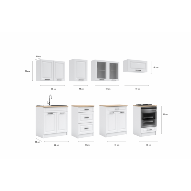 • Výška skříňěk dolních: 86 cm (2,8 cm pracovní deska/ 10 cm sokl)