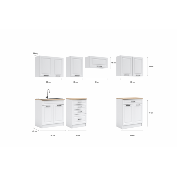 - Výška spodních skříněk: 86 cm (2,8 cm pracovní deska / 10 cm sokl)