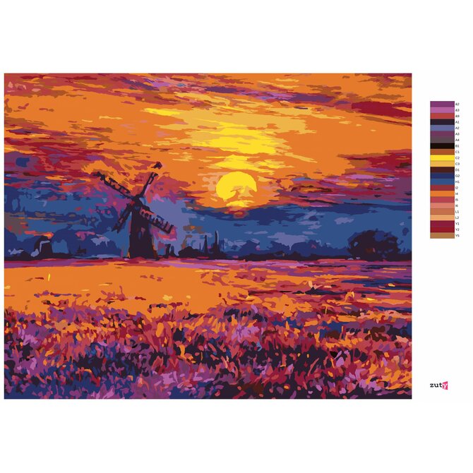 Malování podle čísel - BAREVNÝ ZÁPAD SLUNCE A VĚTRNÝ MLÝN