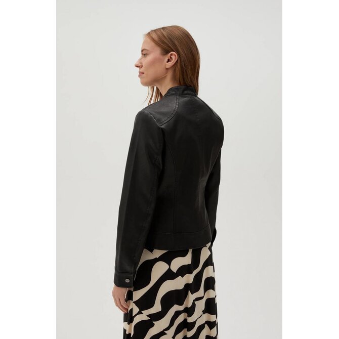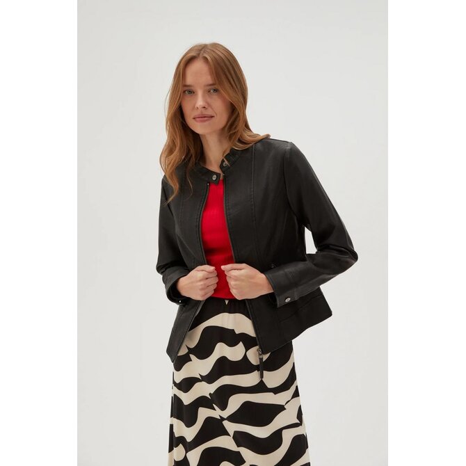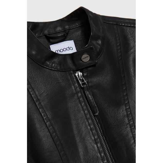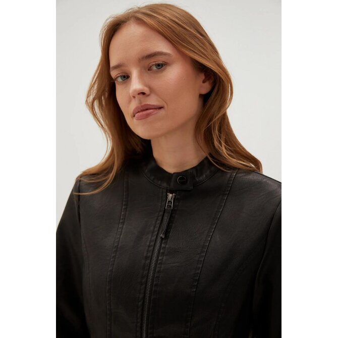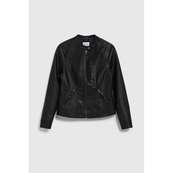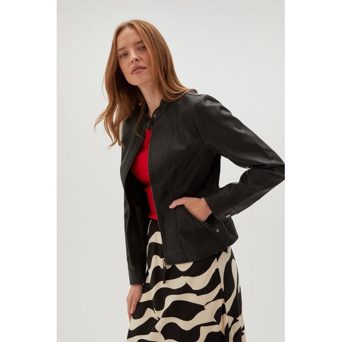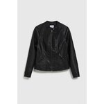 VNĚJŠÍ VRSTVA: 60% POLYURETAN 40% POLYESTER PLÁŠŤ NA POLŠTÁŘ: 100% POLYESTER Dámská bunda černé barvy, bez vzoru, z hladkého polyuretanu imitující kůži. Má praktické kapsy, jednořadý zip, rukávy s manžetami a stojáček. Díky podšívce je velmi příjemná na dotek a pohodlně se nosí. Stylové sako se bude hodit k mnoha příležitostem – všedním i elegantnějším. Skvěle se hodí k džínům nebo sukni a dodává stylu jedinečný charakter. Ideální nabídka pro ženy, které oceňují módní vzhled a pohodlí.