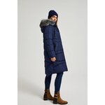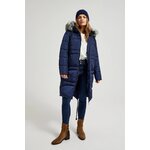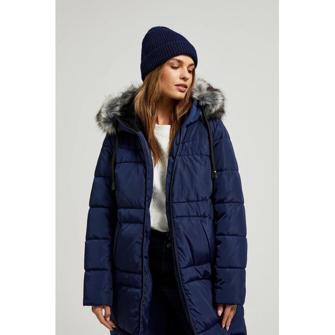 100% POLYESTER Zimní prošívaná bunda v tmavě modré barvě, ideální do chladných dnů. Vyrobeno z hladkého polyesteru, zateplené a podšité, zajišťující teplo a pohodlí. Má praktické kapsy, prošívání a kožešinu v kapuci. Zapínání na zip, sahající pod kolena, ideální do mrazivých dnů.