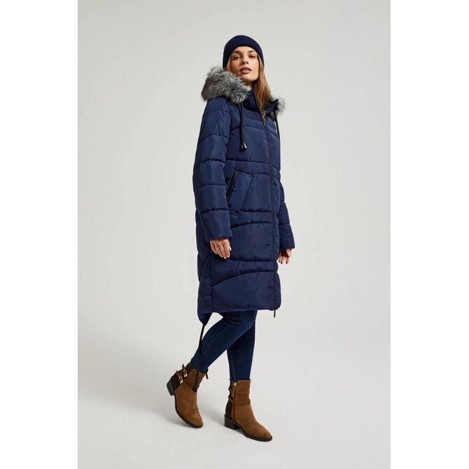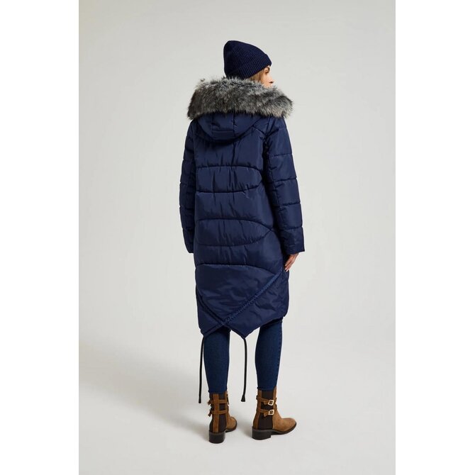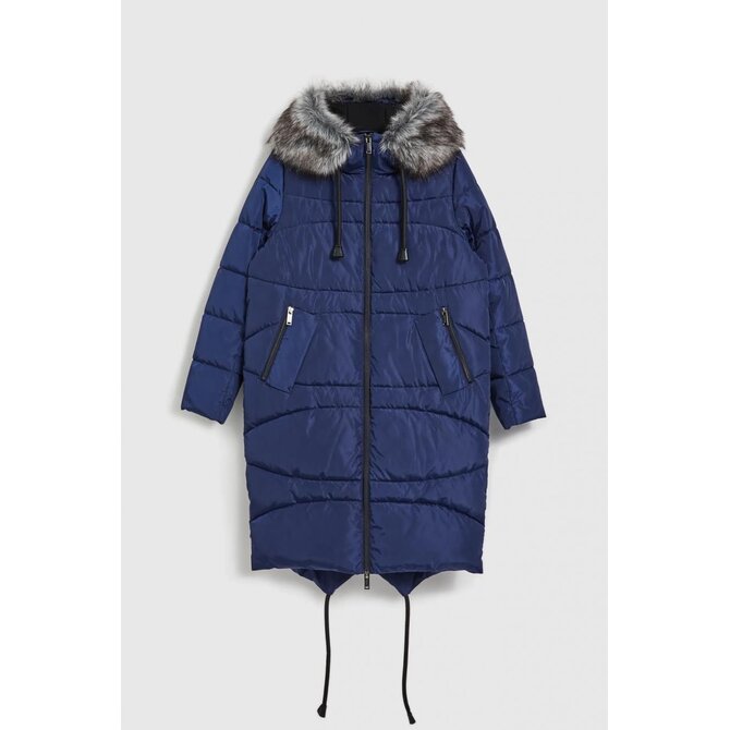 100% POLYESTER Zimní prošívaná bunda v tmavě modré barvě, ideální do chladných dnů. Vyrobeno z hladkého polyesteru, zateplené a podšité, zajišťující teplo a pohodlí. Má praktické kapsy, prošívání a kožešinu v kapuci. Zapínání na zip, sahající pod kolena, ideální do mrazivých dnů.