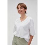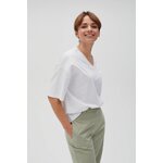 Bílá halenka je perfektní volbou pro každou ženu, která si cení pohodlí a stylu. Vyrobeno z měkké bavlny, zajišťuje pohodlí při nošení. Díky krátkým rukávům a oversize střihu je halenka nejen módní, ale také velmi pohodlná. Výstřih do V dodává eleganci a hladká textura je vhodná pro mnoho různých stylů. Halenka je vhodná pro mnoho příležitostí - jak na každý den, tak na setkání s přáteli nebo do města. Skvěle se hodí k džínům, sukním, ale i elegantním kalhotám či sukním. Díky svému univerzálnímu střihu a klasické bílé barvě je nenahraditelným prvkem dámského šatníku.