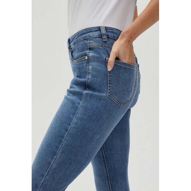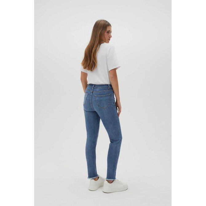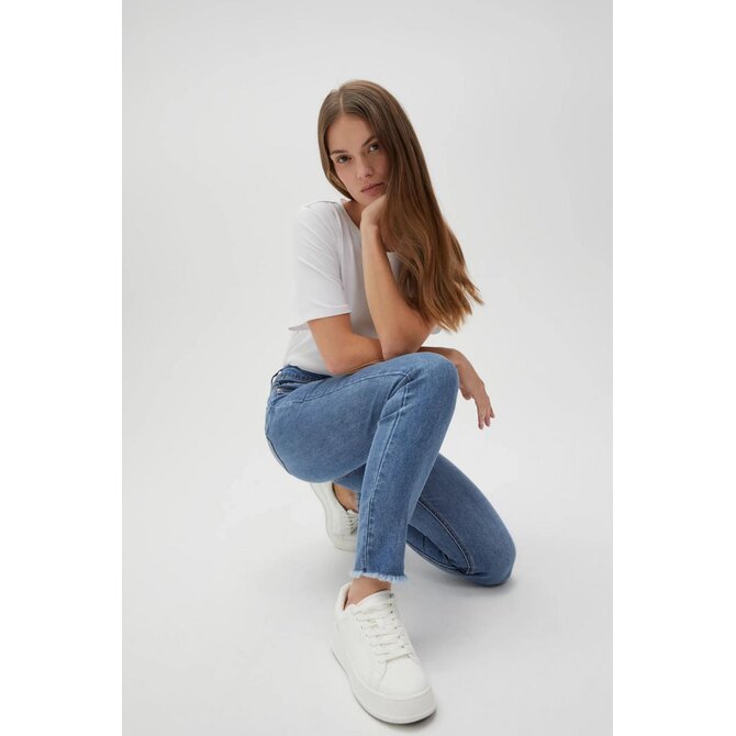 71% BAVLNA, 27% POLYESTER, 2% ELASTAN. Tyto modré dámské džíny jsou naprostou nutností ve vašem šatníku! Jsou vyrobené z vysoce kvalitní bavlny, jsou hladké a bez vzoru, což zaručuje pohodlí a snadné nošení. Roztřepené nohavice a klasický úzký střih dodávají džínům charakter. Mají zapínání na zip pro snadné oblékání a svlékání. Tyto džíny jsou ideální pro různé příležitosti – od každodenního nošení až po setkání s přáteli nebo večerní zábavu. Perfektně se hodí k teniskám, podpatkům, teniskám nebo sandálům. V kombinaci s jednoduchým tričkem nebo elegantní halenkou vytvoří módní outfit, který bude vždy v módě. Dámské džíny – klasika s moderním nádechem!