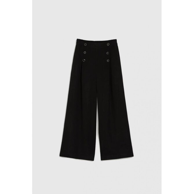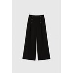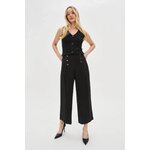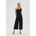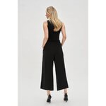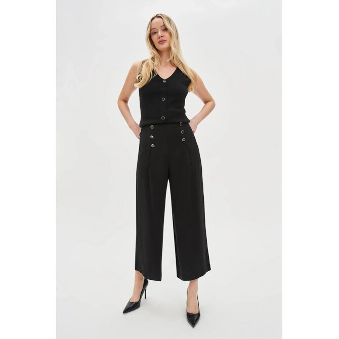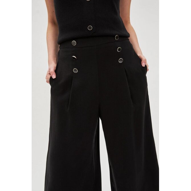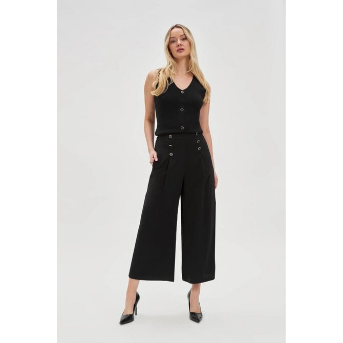 93% VISKÓZA, 7% POLYESTER Tyto černé dámské kalhoty jsou perfektní volbou pro ženy, které si cení pohodlí a stylu. Jsou vyrobeny z lehké a prodyšné viskózy a poskytují celodenní pohodlí. Široké nohavice a vysoký pas tvarují postavu, zatímco elastický pas dodává kalhotám nádech šarmu. Kalhoty mají praktické kapsy, záševky a módní střih culotte. Díky délce 7/8 jsou vhodné pro mnoho příležitostí, ať už pro každodenní nebo formálnější nošení. Dokonale doplňují elegantní i ležérní outfity a skvěle se hodí k elegantní halence, svetru nebo tričku.