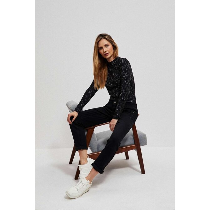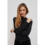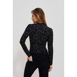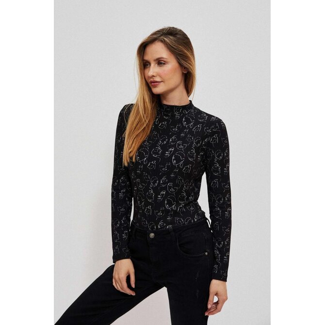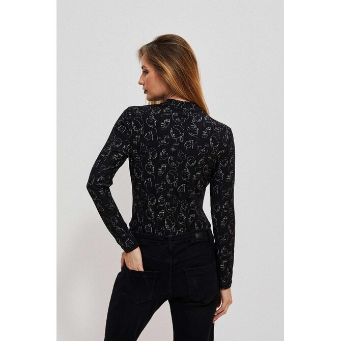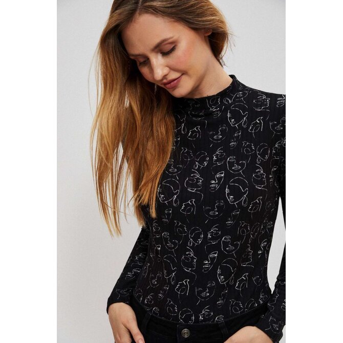 Dámská černá halenka s dlouhým rukávem. Neobvyklý bílý potisk ukazuje ženské tváře. Pružný a jemně žebrovaný materiál se přizpůsobí postavě.