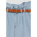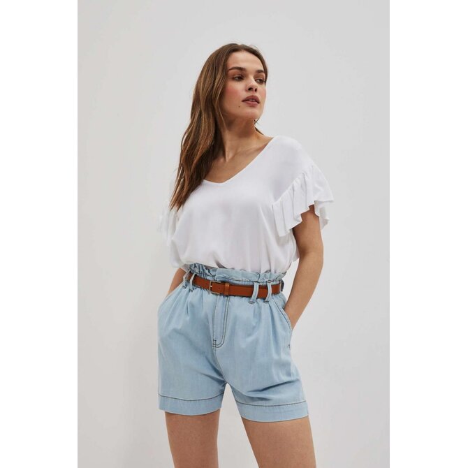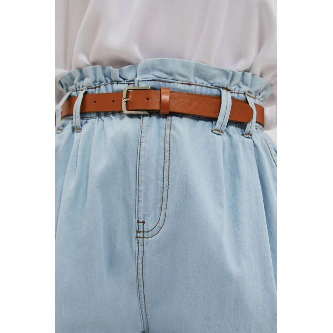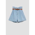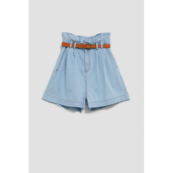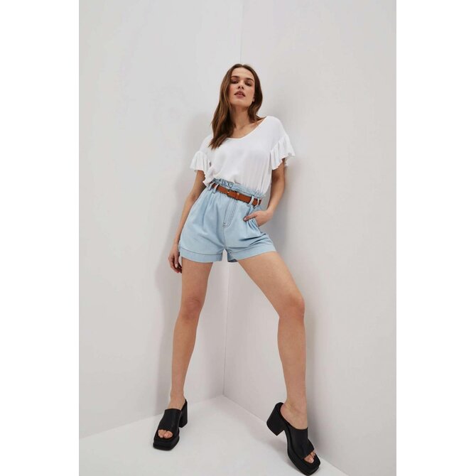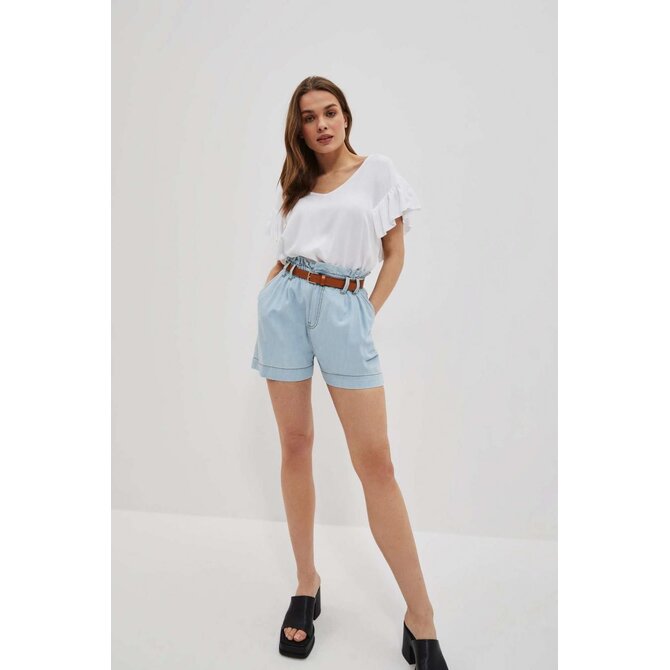 Šortky s vysokým pasem a páskem: Dámské šortky ve světle modré barvě, jednobarevné a bez vzorů či otěru. Díky látkovému řasení v pase a stylovému pásku z ekologické kůže můžete snadno upravit obvod šortek a přizpůsobit je své postavě. Zapínání na zip a knoflík zajišťuje pohodlné oblékání.