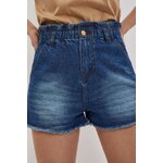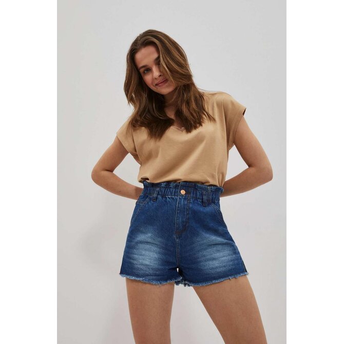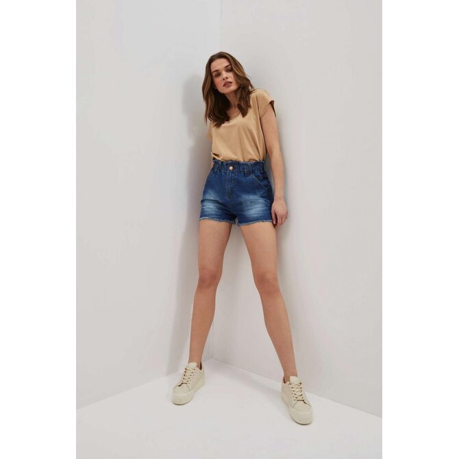 Námořnicky modré dámské šortky, vpředu silná světlejší tkanina, která se třepí. Pas s řasením v materiálu a gumou, díky které se dokonale přizpůsobí siluetě. Navíc se zapínají na zip a knoflík. Mají vysoký střih, který jemně zvýrazňuje pas a poskytuje vysoký komfort při nošení. Pohodlné a praktické kapsy na přední i zadní straně. Krátké a volné nohavice, na koncích navíc roztřepené. Vyrobeny z bavlny, takže jsou odolné, pohodlné a poskytují přiléhavý střih. Lze je nosit každý den, do školy, do práce, na procházky, na nákupy, na setkání s přáteli nebo na dovolenou. Hodí se k různým stylům s topy, košilemi, halenkami nebo svetry. Perfektní na léto!