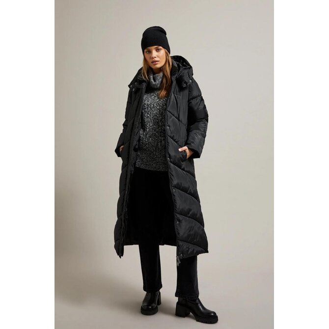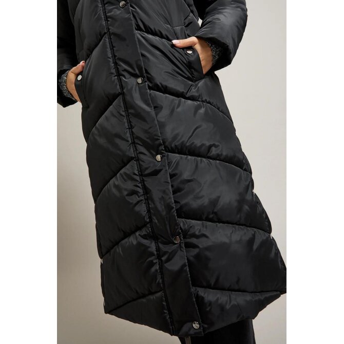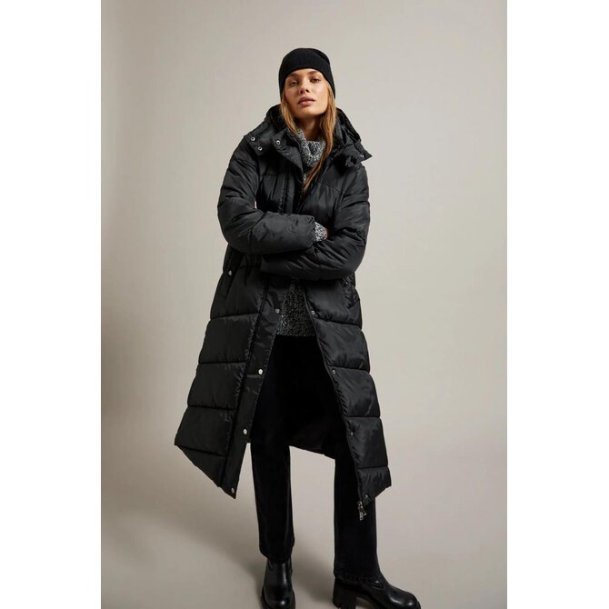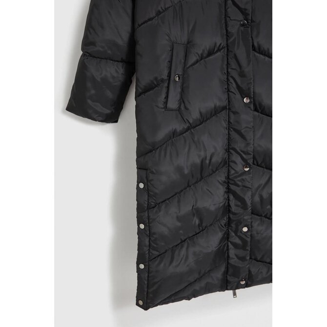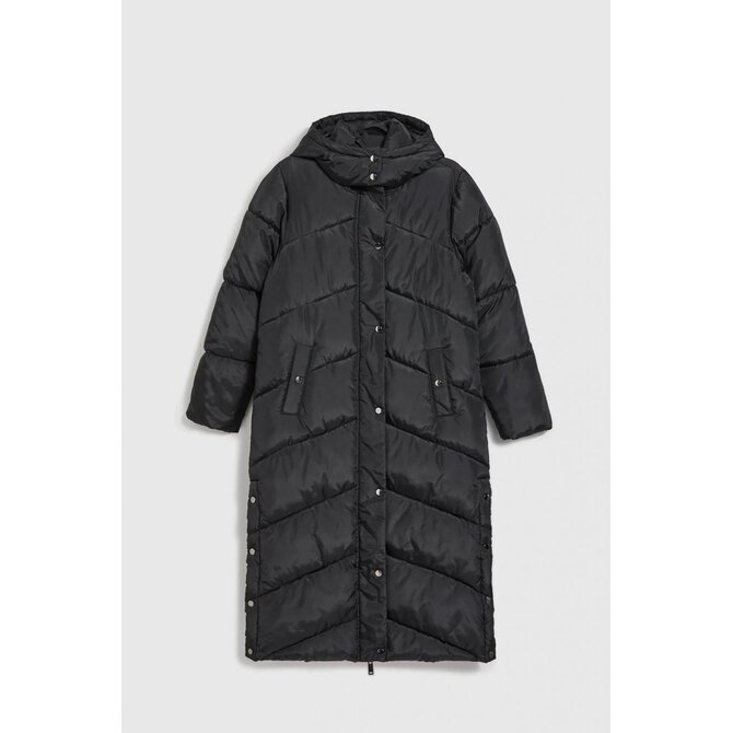 Dámská bunda černé barvy, hladká, bez vzoru, ideální do chladnějších dnů. Vyrobeno z polyesteru, je lehké a pohodlné na nošení. Má praktické kapsy, prošívání a zateplení, zajišťující teplo a pohodlí. Prošívaná, podšitá konstrukce dodává eleganci a styl. Rukávy jsou dlouhé a bunda má kapuci a zip. Ideální na zimu, dosahující do půlky lýtek. Tato bunda se hodí pro mnoho příležitostí, jak ležérní, tak i formálnější. Může být perfektním doplňkem k ležérnímu i elegantnějšímu outfitu. Stojí za to přidat do své sbírky šatníku!