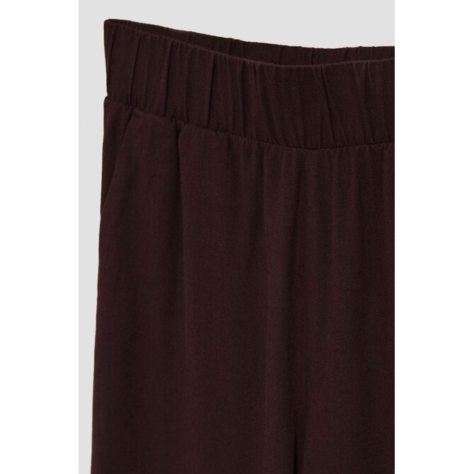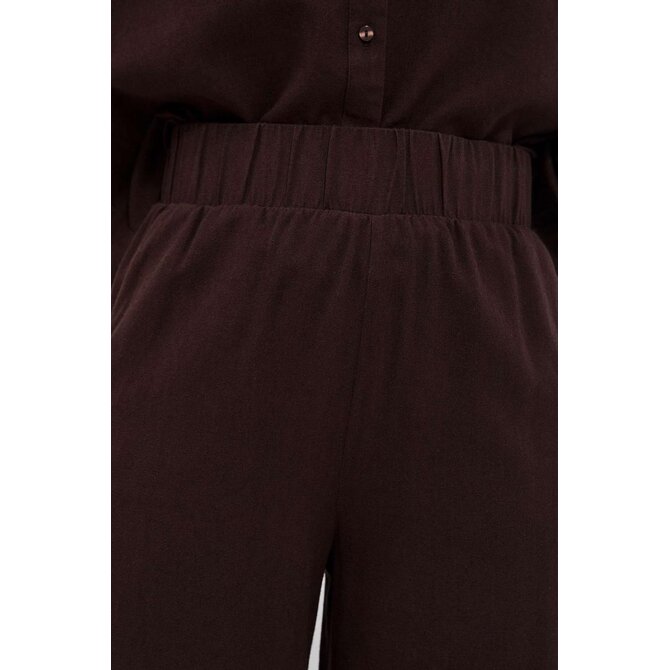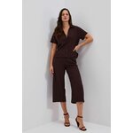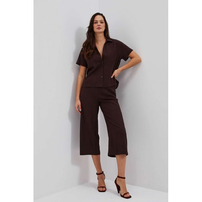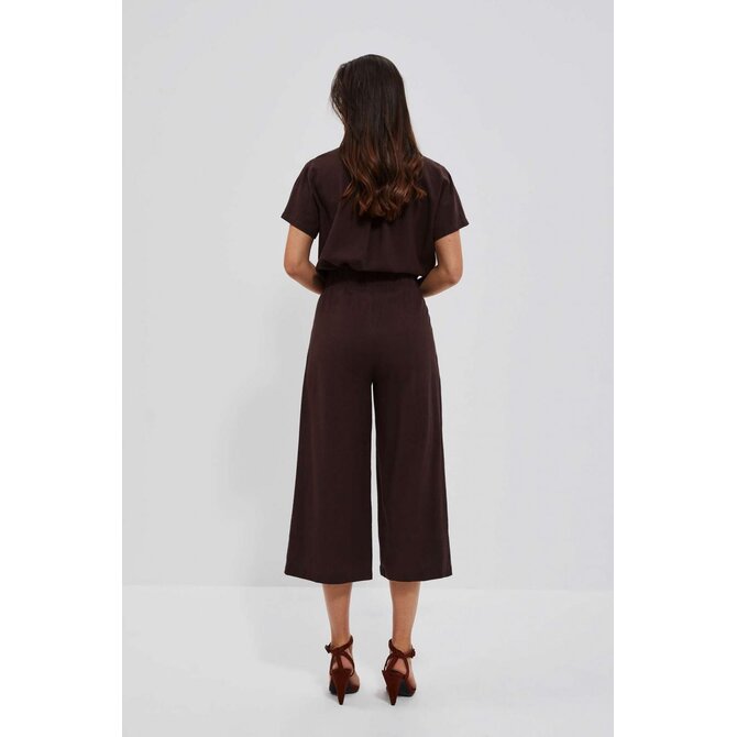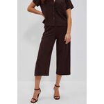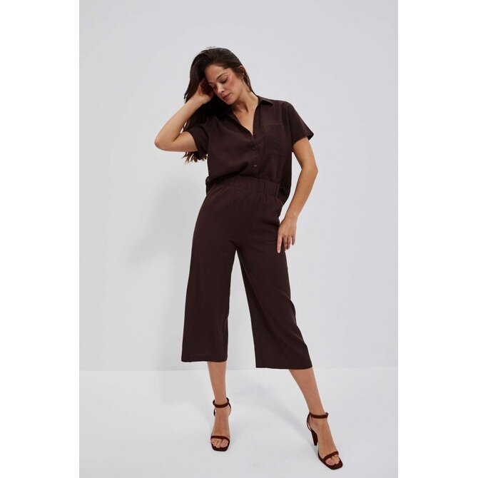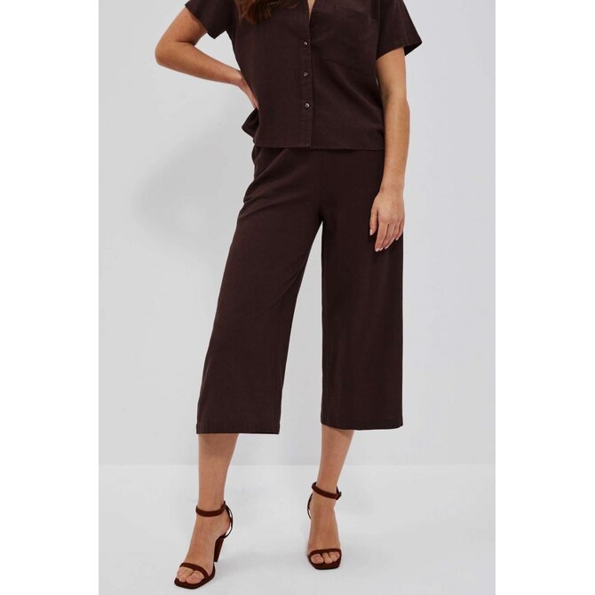 Dámské kalhoty culotte s volným střihem v atraktivním hnědém odstínu. Hladký materiál bez vzorů dodává kalhotám sofistikovaný vzhled. Široké nohavice v délce 7/8 a vysoký pas s elastickým pásem pro perfektní přizpůsobení vaší postavě. Tento model kalhot je ideální volbou pro horké letní dny nebo pro tu nejlepší dovolenou. Kalhoty jsou vzdušné a pohodlné, takže se v nich budete cítit volně a ležérně každý den.