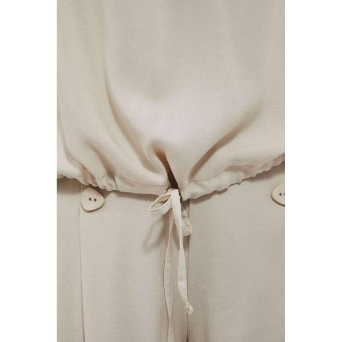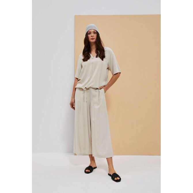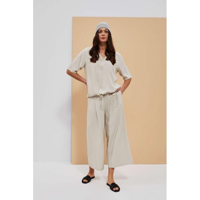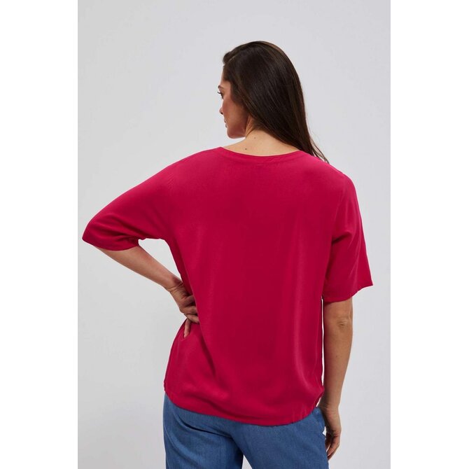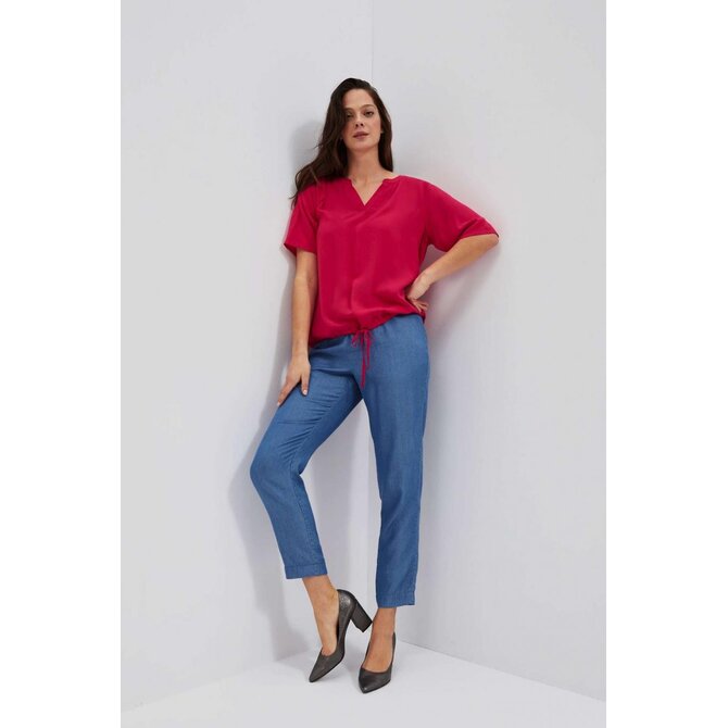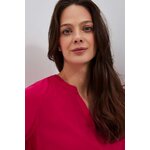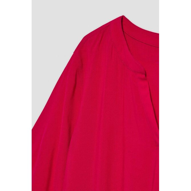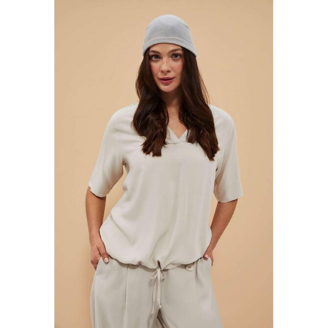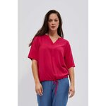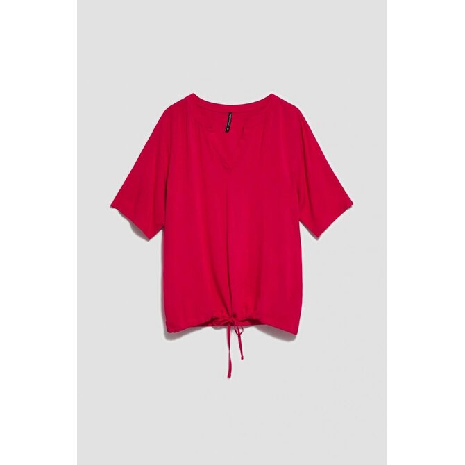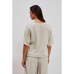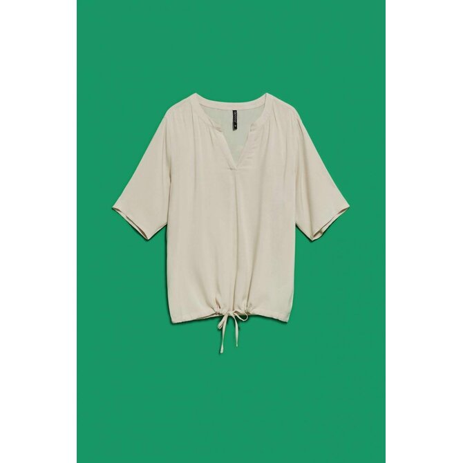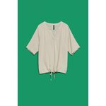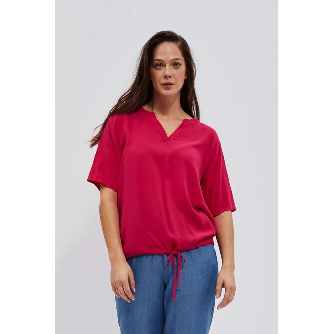 Hladká košile. Široký a volný střih, který neomezuje v pohybu. Ve spodní části košile je zajímavá kravata. Prodloužené krátké rukávy sahající k loktům. Výstřih do V se stojáčkem. Univerzální a praktický střih, který padne každé postavě. Vloženo přes hlavu. Hladký materiál, žádné vzory. Ideální nabídka pro ženy, které hledají volný každodenní
