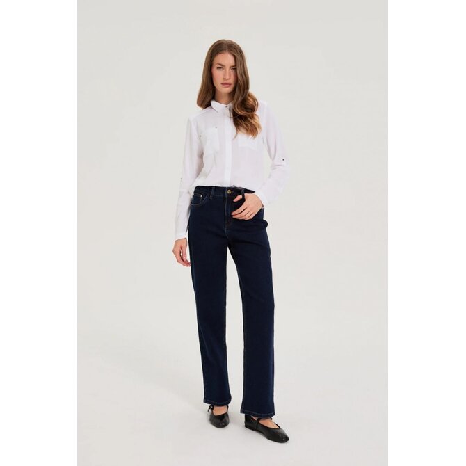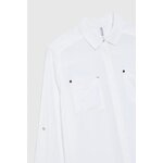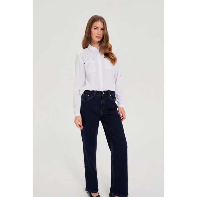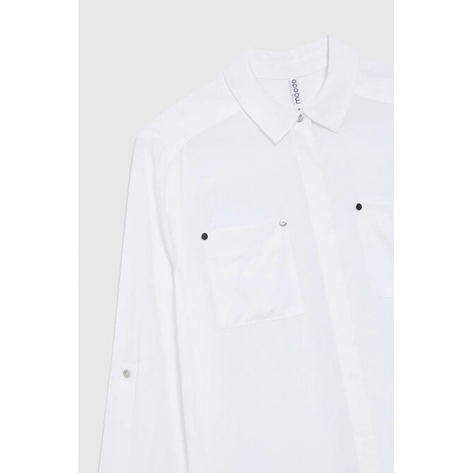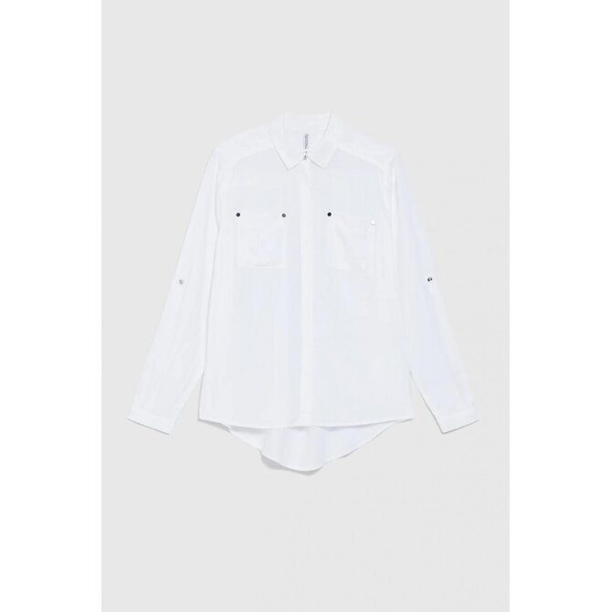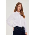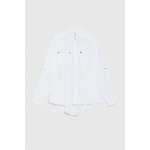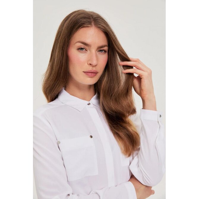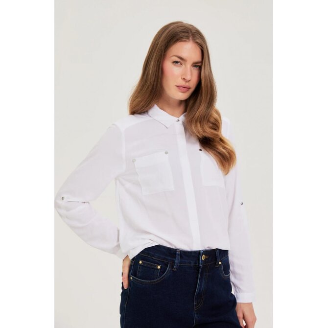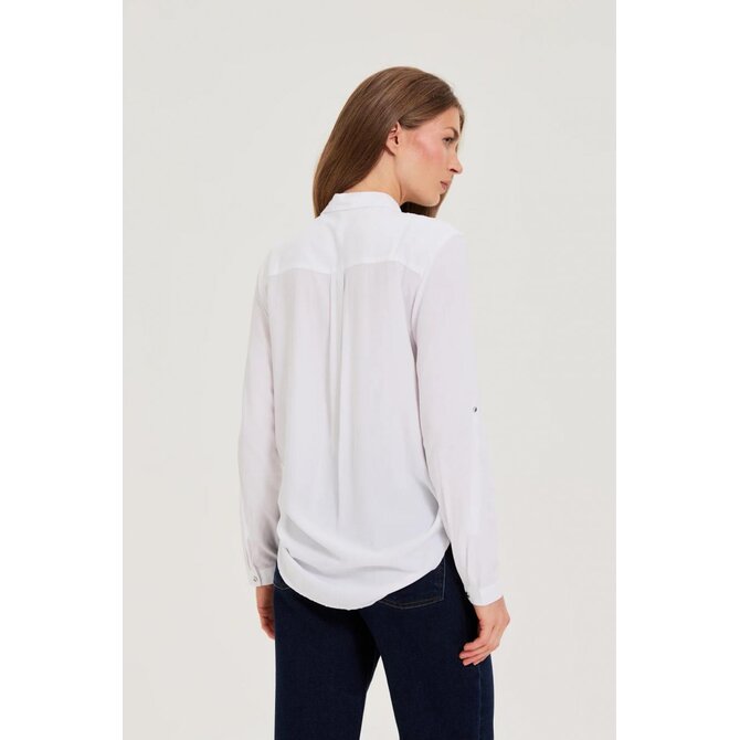 100% VISKÓZA. Tato bílá dámská košile s hladkou texturou zaujme svým klasickým střihem a elegantním provedením. Díky ohrnutým rukávům nabízí tento model přiléhavou délku a klasický límec podtrhuje jeho všestranný styl. Lehká viskóza zajišťuje pohodlí a prodyšnost po celý den. Je ideální volbou do kanceláře, na obchodní schůzky nebo na neformální výlety s přáteli. Perfektně se hodí k látkovým kalhotám, elegantní pouzdrové sukni nebo džínům. Je ideální k vrstvení se sakem nebo kardiganem. Jednoduchá bílá košile je nezbytným kouskem v šatníku každé ženy a zaručuje nadčasovou eleganci.