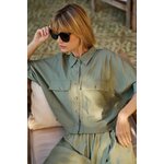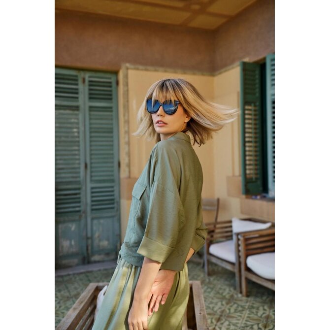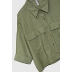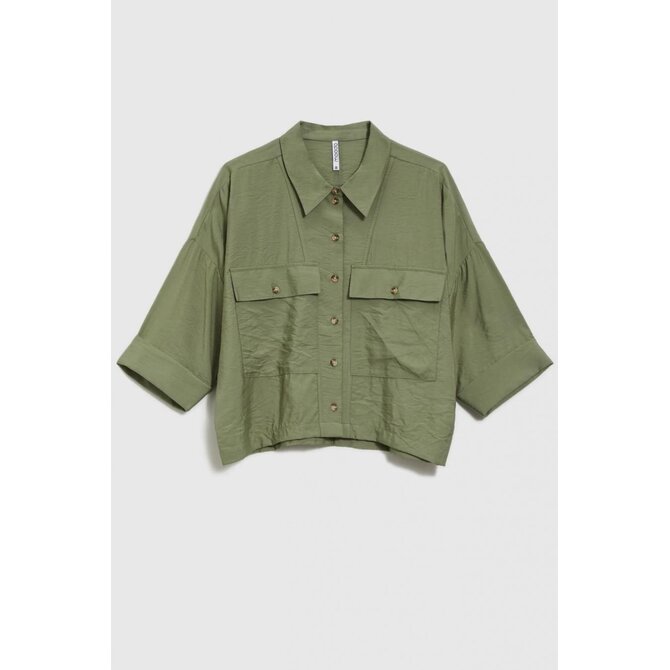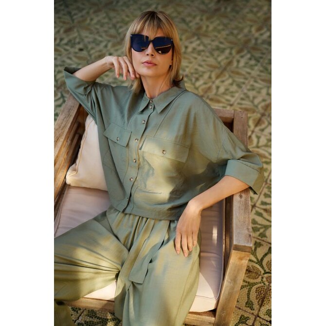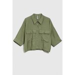 88 % VISKÓZA, 12 % POLYAMID. Tato dámská olivově zelená košile je vyrobena z pohodlné viskózy. Má volný střih s praktickými kapsami a knoflíky. Má ohrnuté tříčtvrteční rukávy a elegantní manžety. Má límeček. Ideální pro mnoho příležitostí – do práce i na společenské akce. Skvěle se hodí k džínům, sukni a elegantním kalhotám. Tento všestranný kousek šatníku vám vždy dodá módní a stylový vzhled.