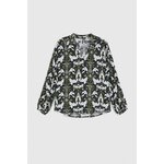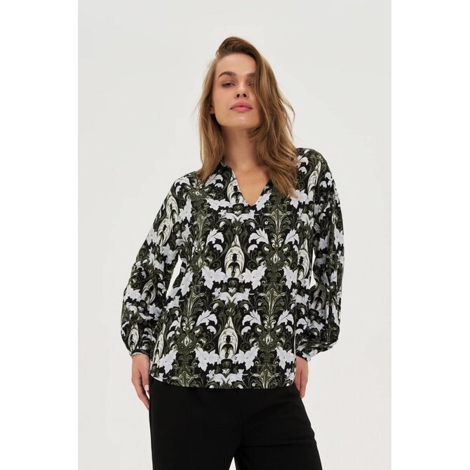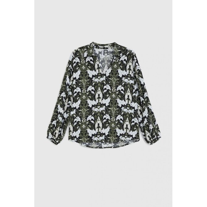 Tato dámská košile ze 100% viskózy v olivově zelené barvě zaujme svým decentním ornamentálním vzorem, který dodává vzhledu osobitý charakter. Klasický límec v kombinaci s moderním výstřihem do V zdůrazňuje krk a ramena a zajišťuje elegantní vzhled pro každou příležitost. Dlouhé rukávy jsou ideální jak pro chladnější dny, tak pro formální události. Lehká a vzdušná tkanina na bázi viskózy zaručuje pohodlí a hebkost. Ideální pro obchodní schůzky, rodinné oslavy nebo večerní výlety. Perfektně se hodí k elegantním látkovým kalhotám, pouzdrové sukni a klasickým džínům. Tato olivově zelená košile s ornamentálním vzorem je nezbytným kouskem v šatníku každé milovnice nadčasové elegance.