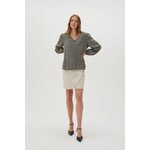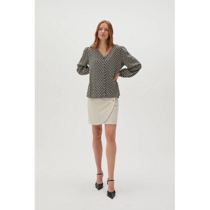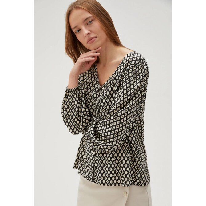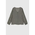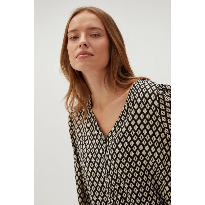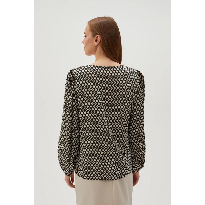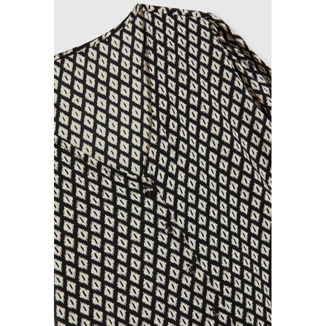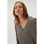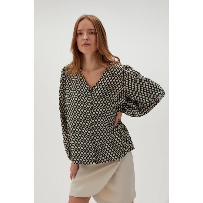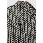 100% VISKÓZA Černá dámská košile s geometrickým vzorem, vyrobená z viskózy. Dlouhé nabírané rukávy a nabírané manžety zvýrazňují ženskou siluetu. Výstřih do V s knoflíky dodává košili nadčasové kouzlo. Vhodné na večerní výlety a společenská setkání. Skvěle se hodí k elegantním kalhotám nebo sukni klasického střihu. Ideální nabídka pro ženy, které oceňují originální design a pohodlí při nošení.