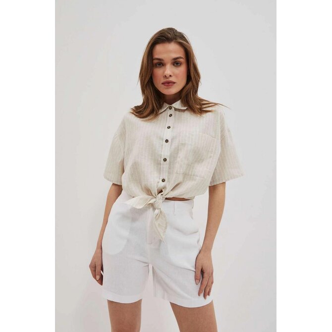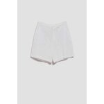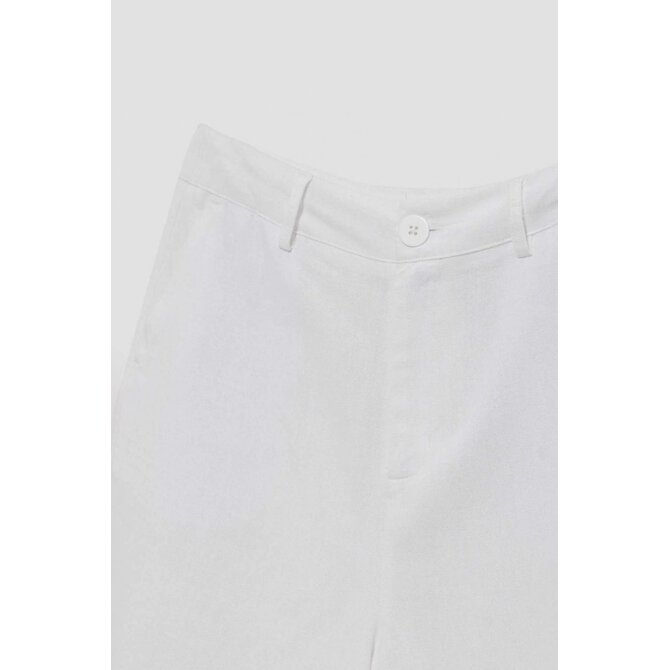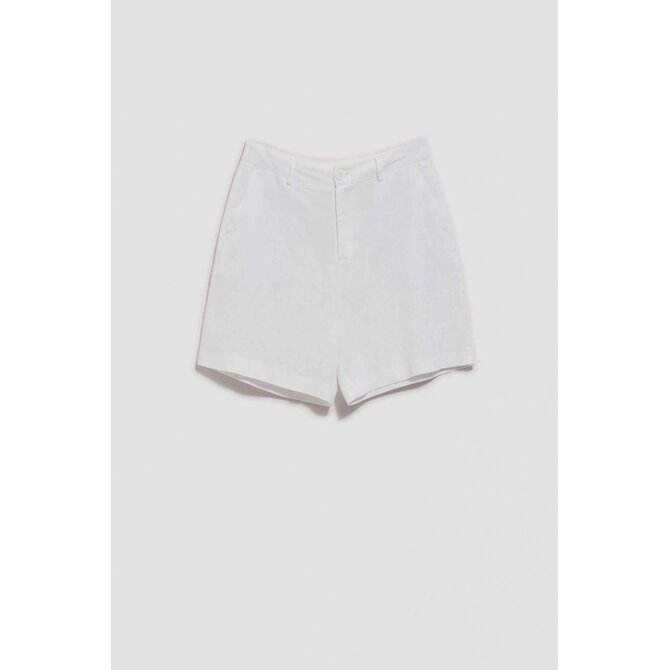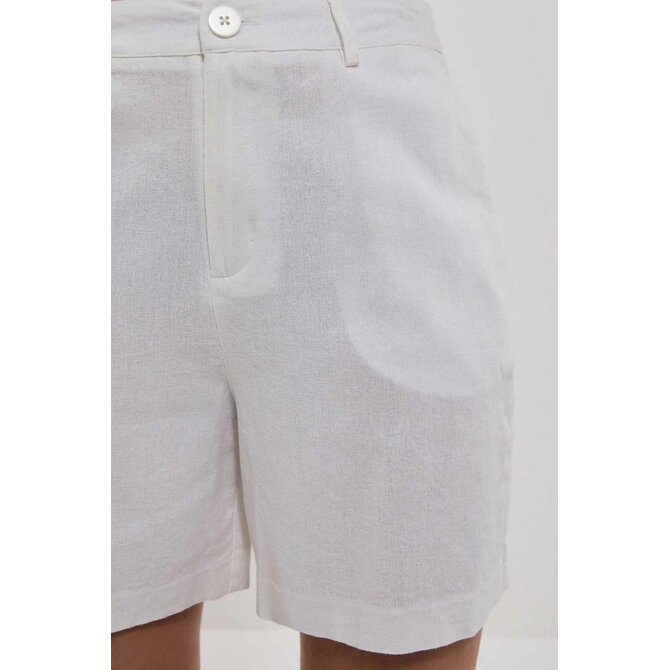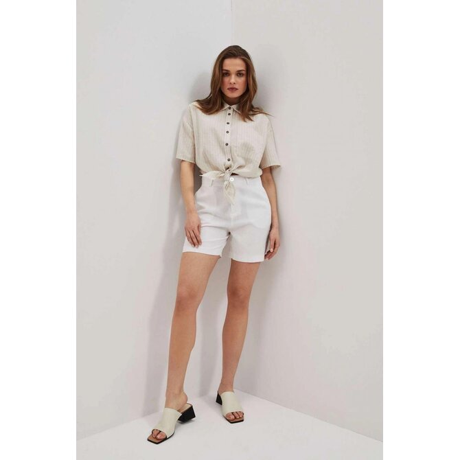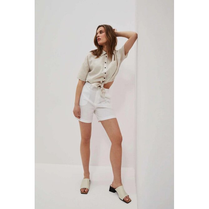 85% POLYESTER, 10% LEN, 5% BAVLNA Elegantní kraťasy v bílé barvě. Vysoký pas, velmi pohodlné na nošení. Krátké, rovné nohy, sahající do poloviny stehen. Zapínání na knoflík a zip v pase. Dodatečně všitá poutka na opasek. Ideální na léto v setu s halenkami nebo košilemi.
