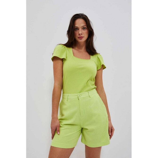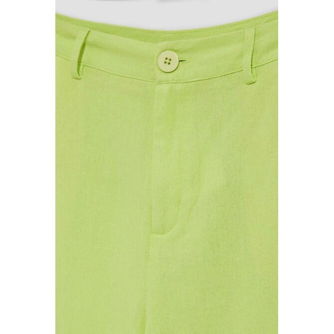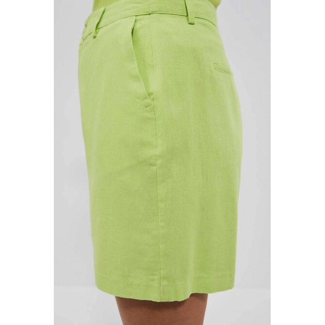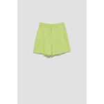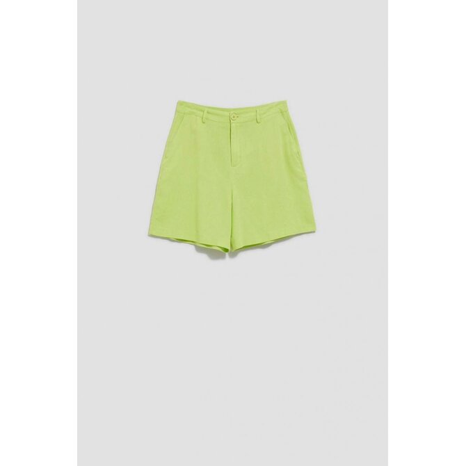 85% POLYESTER, 10% LEN, 5% BAVLNA Elegantní kraťasy v limetkové barvě. Vysoký pas, velmi pohodlné na nošení. Krátké, rovné nohy, sahající do poloviny stehen. Zapínání na knoflík a zip v pase. Dodatečně všitá poutka na opasek. Ideální na léto v setu s halenkami nebo košilemi.
