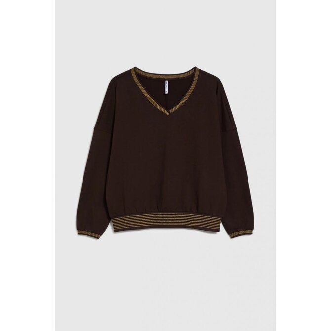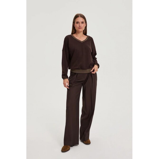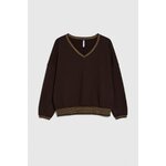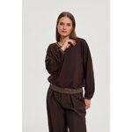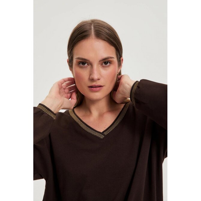 95% BAVLNA, 5% ELASTAN Tato dámská mikina v čokoládově hnědém odstínu s jemnými zlatými akcenty zaujme svým minimalistickým, hladkým a nevzorovaným designem. Hluboký výstřih do V krásně zdůrazňuje krk a zeštíhluje siluetu, zatímco dlouhé rukávy a žebrované manžety zajišťují pohodlí a ochranu před chladem. Tento model bez kapuce s natahováním je praktickou volbou pro každý den. Jemná přírodní bavlna zajišťuje měkkost a prodyšnost, zatímco strečové žebro umožňuje volnost pohybu. Ideální na schůzky s přáteli, večerní procházky nebo návštěvu kavárny. Perfektně se hodí k džínům, klasickým legínám a midi sukni. Hodí se k ležérním a poloformálním outfitům a vytváří stylový vzhled pro každou příležitost.