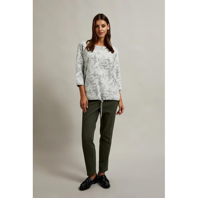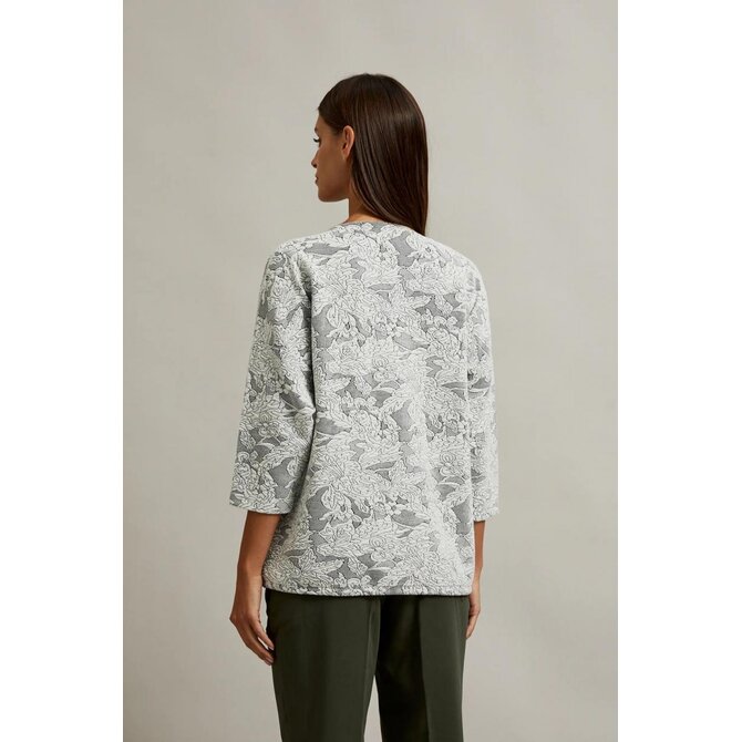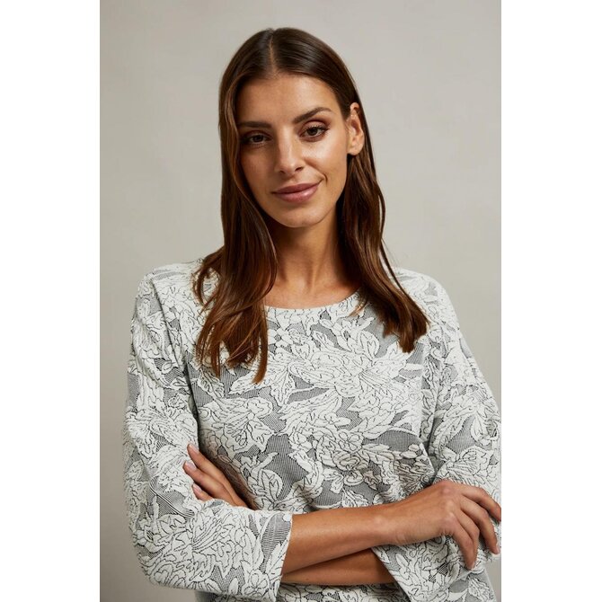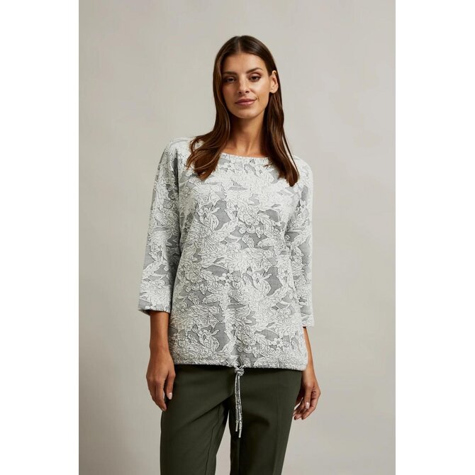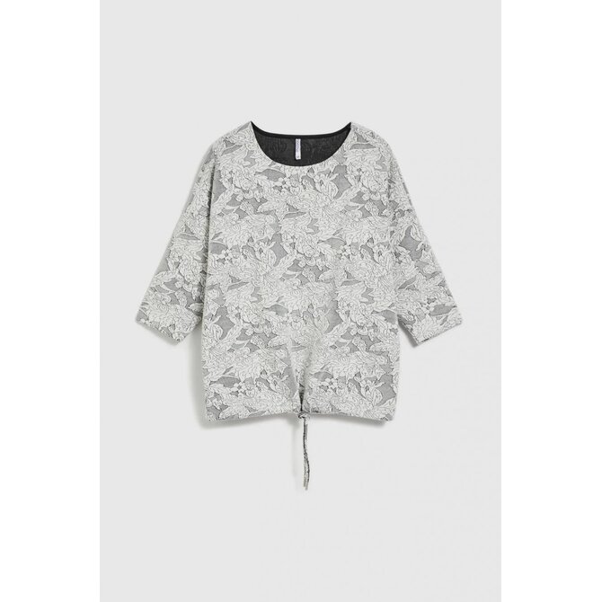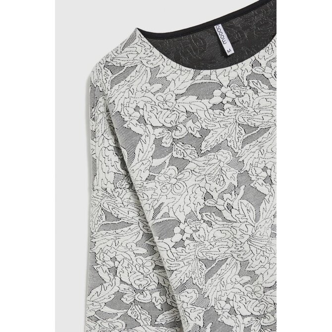 75% POLYESTER, 25% BAVLNA Dámská mikina, vyrobená z příjemného materiálu v bílé a šedé barvě s reliéfním květinovým vzorem. Má dlouhé rukávy a lodičkový výstřih, což mu dodává elegantní vzhled. Mikina se zapíná šněrováním vpředu. Tato mikina je ideální pro mnoho příležitostí - jak pro každodenní nošení, tak i pro setkání s přáteli nebo rande. Skvěle se hodí jak k džínám, tak k sukni nebo elegantním kalhotám. Díky univerzálnímu vzoru bude perfektním doplňkem mnoha stylů.