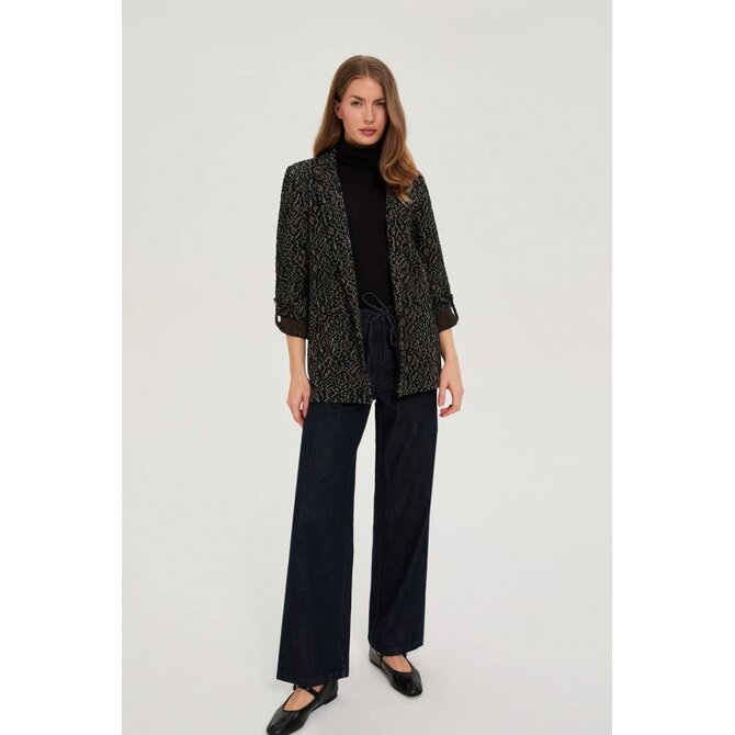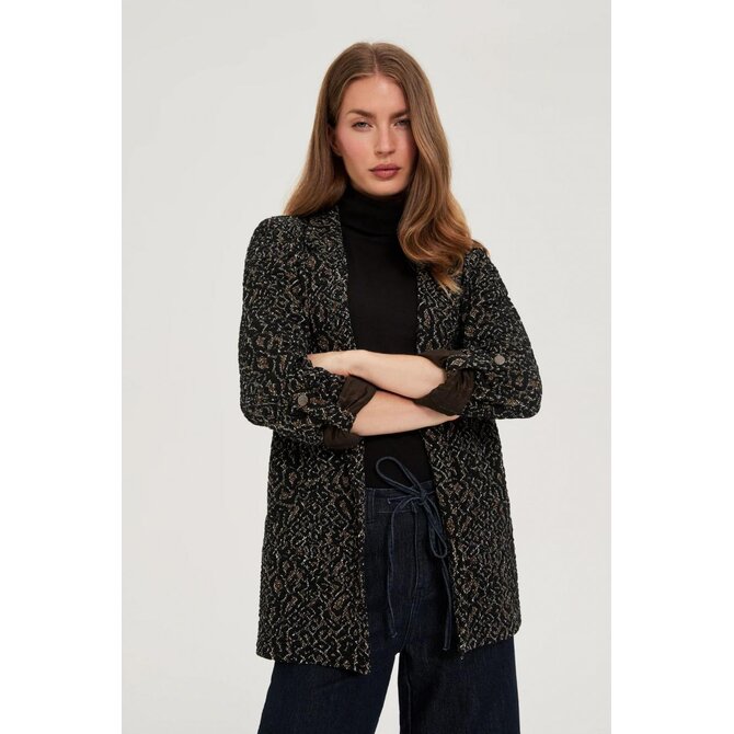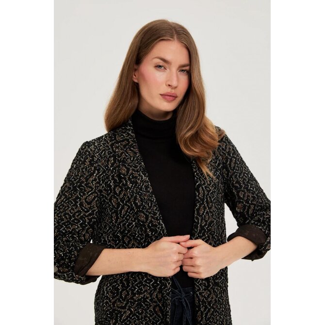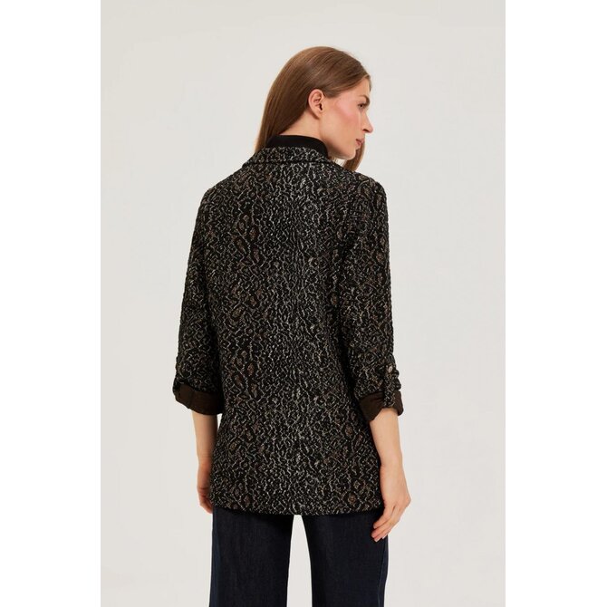86% POLYESTER, 12% VISKÓZA, 2% ELASTAN, PODŠÍVKA: 100% POLYESTER. Toto černé sako s unikátním zvířecím potiskem zaujme svým originálním designem a dodá charakter každému outfitu. Nárameníky dodávají módní nádech, zatímco praktické kapsy zdůrazňují funkčnost. Otevřené zapínání vpředu zajišťuje snadné a lehké nošení, zatímco dlouhé rukávy poskytují ochranu v chladnějších dnech. Pečlivě vybraný polyester činí látku měkkou na dotek a snadno se o ni pečuje. Ideální volba pro každodenní nošení nebo do práce, kde je klíčové pohodlí v kombinaci s jedinečným stylem. Perfektně se hodí ke klasickým džínům, pouzdrové sukni, ale i k elegantním cigaretovým kalhotám a jednobarevné halence. Toto sako se perfektně hodí k ležérním i poloformálním outfitům a zdůrazní individualitu každého šatníku.