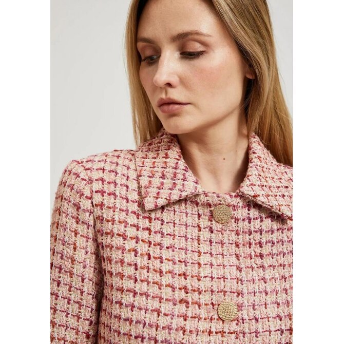 MATERIÁL 1: 100% POLYESTER, MATERIÁL 2: 100% POLYESTER Růžová dámská bunda, vyrobená z vysoce kvalitního polyesteru. Díky strukturálnímu žebrovému materiálu vypadá extrémně stylově a elegantně. Sako má zapínání na jednořadé knoflíky a dlouhé rukávy, což mu dodává nadčasový charakter. Navíc je vybavena praktickými kapsami. Tento produkt je ideální jak pro každodenní styling, tak pro zvláštní příležitosti. Bunda se skvěle hodí k elegantním kalhotám, džínům nebo sukni. Díky svému univerzálnímu designu se perfektně hodí do různých šatníků a umožňuje vytvářet různé styly. Dámská bunda vyniká nejen svým jedinečným vzhledem, ale také vysokou kvalitou zpracování, díky čemuž je vynikající volbou pro ženy, které si cení elegance a stylu.
