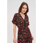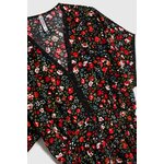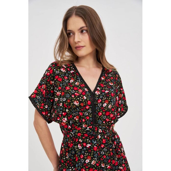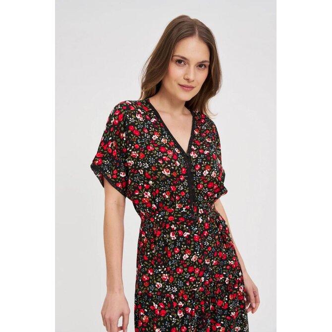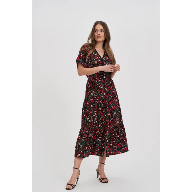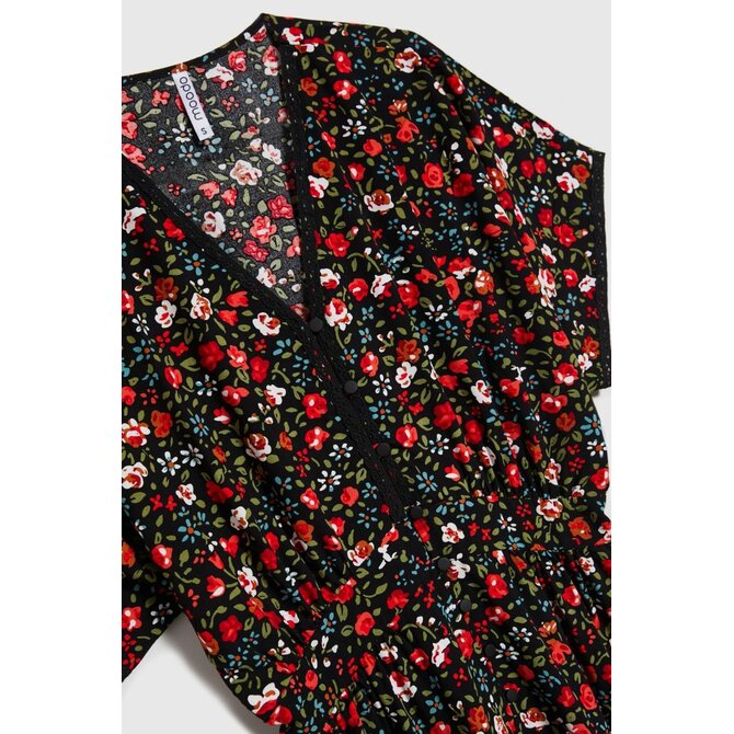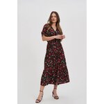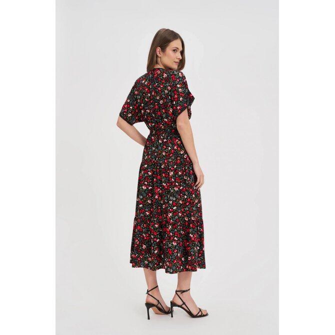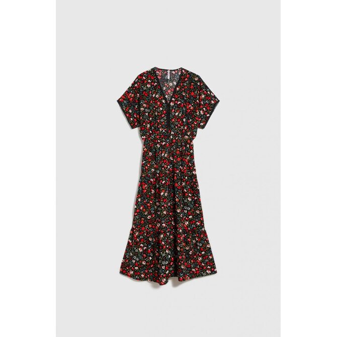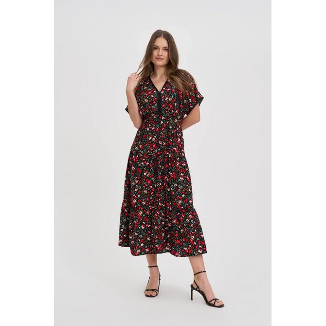 100% VISKÓZA Rozevláté maxi šaty v klasické černé barvě s vícebarevným květinovým motivem a ozdobným volánem ve spodní části. Střih zdůrazňující pas, zvýrazněný gumičkou, poskytuje pohodlí a ženský vzhled. Zapínání na knoflíky a výstřih do V dodávají eleganci a lehkost. Vyrobeny ze vzdušné viskózy, zaručují pohodlí po celý den. Ideální do práce, na zvláštní příležitosti, schůzky nebo procházky po pláži. Perfektně se hodí ke klasickým sandálům, espadrilkám, ale i k elegantním vysokým podpatkům nebo balerínkám. Stylově vypadají v kombinaci s kardiganem, sakem nebo motorkářskou bundou.