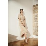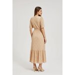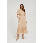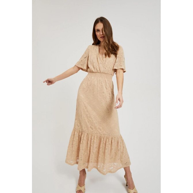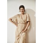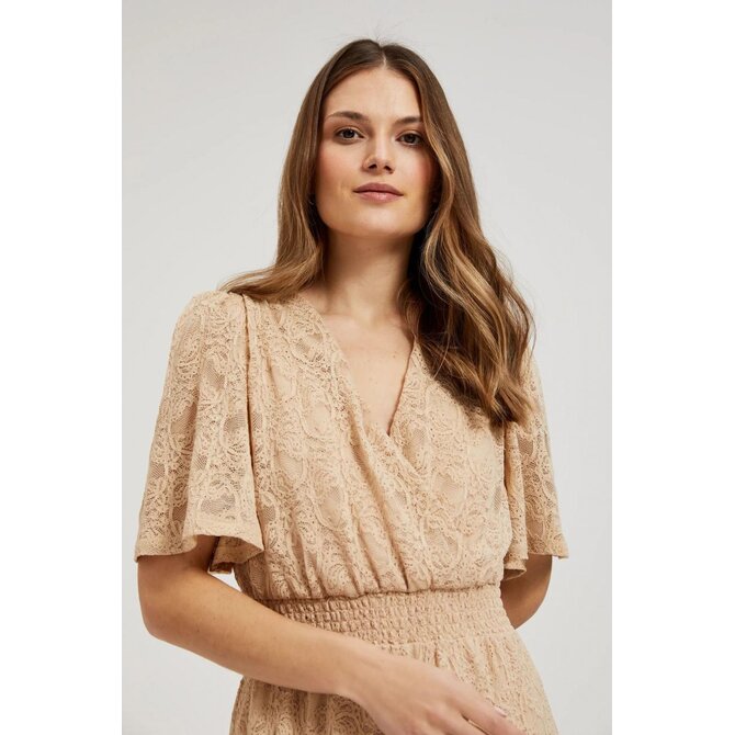MATERIÁL 1: 90% POLYAMID, 10% ELASTAN, MATERIÁL 2: 100% POLYESTER Elegantní béžové šaty s jemnou krajkou a květinovým vzorem. Vyrobeno z vysoce kvalitních materiálů, zajišťujících pohodlí při nošení. Šaty mají rozšířené rukávy, volány a pružný pas, díky čemuž perfektně padnou na postavu. Navíc je vybavena podšívkou, díky které se pohodlně nosí. Ideální jak pro zvláštní příležitost, tak pro každý den. Díky svému klasickému designu budou šaty perfektní jako součást šatníku pro mnoho různých příležitostí. Lze jej kombinovat jak s elegantními vysokými podpatky, tak s ležérními sandály. Bude vypadat perfektně jak na pláži, tak na letních setkáních. Šaty s výstřihem do V a trapézový tvar do poloviny lýtek zvýrazní každou postavu a dodají jí trochu půvabu a elegance.