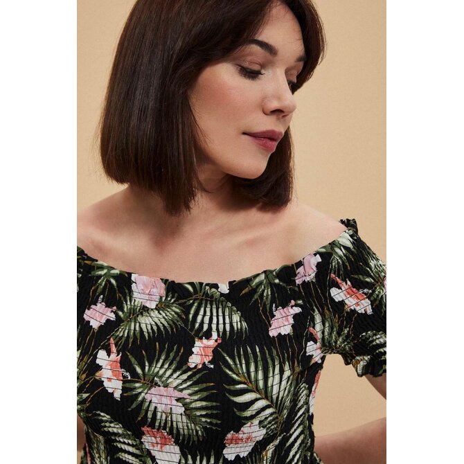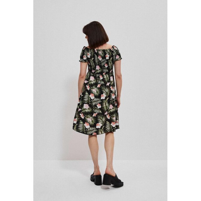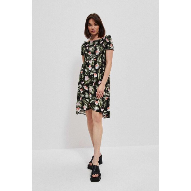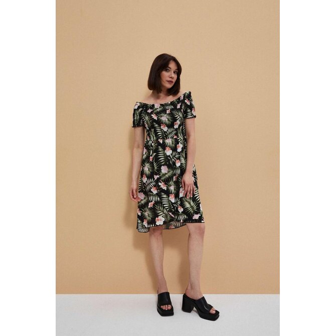 Tyto šaty nesmí chybět ve vašem šatníku! Odpovídající hora ala španělština s rozšířeným dnem. Černá s vícebarevným květinovým vzorem. Výstřih s odhalenými rameny. Originální, poutavé. Skvělá nabídka na letní výlety.