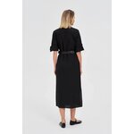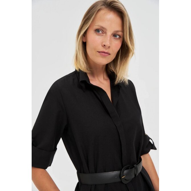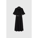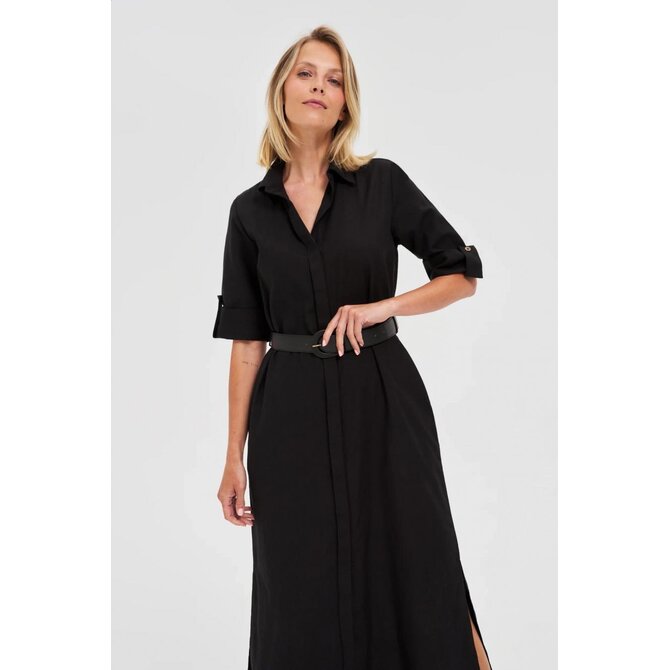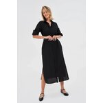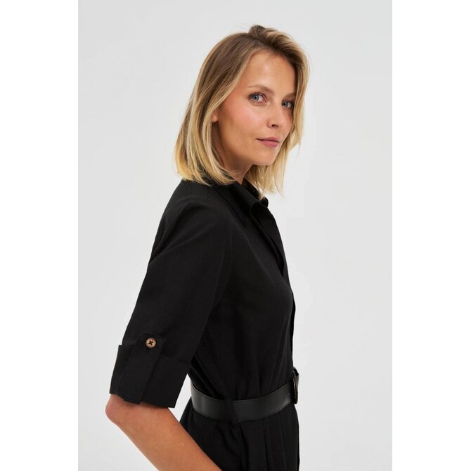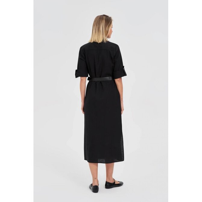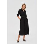85% BAVLNA, 15% LEN Tyto černé šaty mají klasický, minimalistický design, který zaujme svým jednoduchým střihem a funkčností. Hladká bavlněná tkanina zaručuje celodenní pohodlí, zatímco praktické detaily – manžety, límec, knoflíky a stahující pásek – dodávají šatům eleganci a všestrannost. Kapsy zajišťují pohodlí při každodenním nošení, zatímco délka ke kotníkům dodává šatům lehkou a elegantní postavu. Košilový střih a jednoduché zapínání dělají z těchto šatů mimořádně pohodlnou a všestrannou volbu. Přírodní materiál poskytuje prodyšnost a měkkost, ideální jak pro dlouhý den v práci, tak pro zvláštní příležitosti. Šaty se perfektně hodí ke klasickým jehlovým podpatkům a sandálem na podpatku. Vypadají úžasně v kombinaci s minimalistickou kabelkou nebo elegantním sakem.