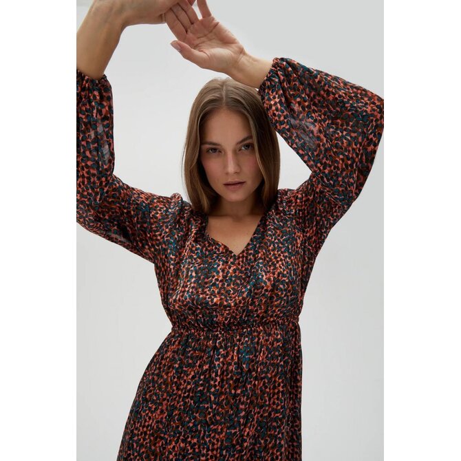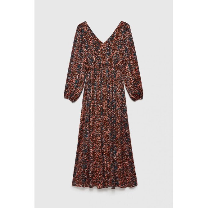 PODŠÍVKA:100% POLYESTER. Hnědé šaty zdobené zvířecím potiskem jsou perfektní volbou pro ženy, které si cení elegance a pohodlí. Rozšířené rukávy a řasení dodávají kouzlo, zatímco elastický pas zvýrazňuje pas. Přiléhavé trapézové šaty jsou ideální pro mnoho příležitostí, jak pro každodenní, do práce, tak pro zvláštní příležitosti. Výstřih do V opticky prodlužuje siluetu a maxi délka dodává na třídě. Lze jej kombinovat s elegantními vysokými podpatky nebo sandály pro vytvoření elegantního vzhledu.