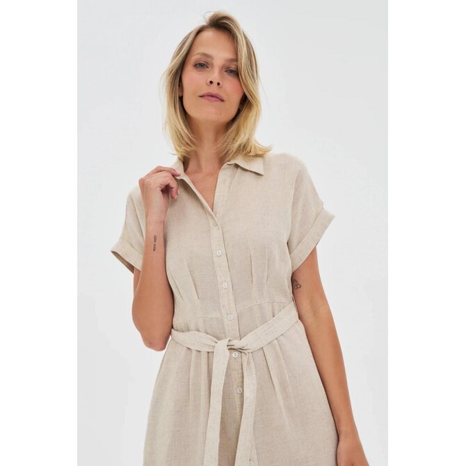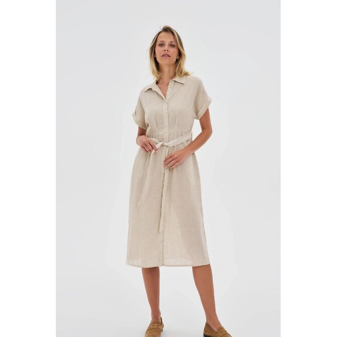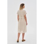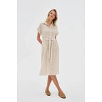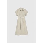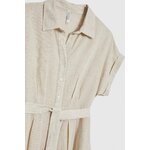 85% VISKÓZA, 15% LEN Tyto béžové košilové šaty zaujmou svým nadčasovým minimalismem a všestranností. Hladká tkanina s vysokým obsahem viskózy zajišťuje prodyšnost a celodenní pohodlí. Klasický límec do V, zapínání na knoflíky a elegantní manžety zdůrazňují čistý a sofistikovaný styl. Pásek zvýrazňuje pas, zatímco praktické kapsy dodávají funkčnost. Jednoduchá délka do poloviny lýtek se hodí k ležérním i formálnějším outfitům. Ideální do práce, na obchodní schůzku, rodinné oslavy nebo na letní procházku po pláži. Perfektně se hodí ke klasickým lodičkám, sandálem, balerínkám nebo teniskám. Skvěle vypadají v kombinaci s jemnými šperky, lehkým sakem nebo džínovou bundou. Béžové košilové šaty jsou nezbytným kouskem v každém šatníku pro milovnice klasického pohodlí.