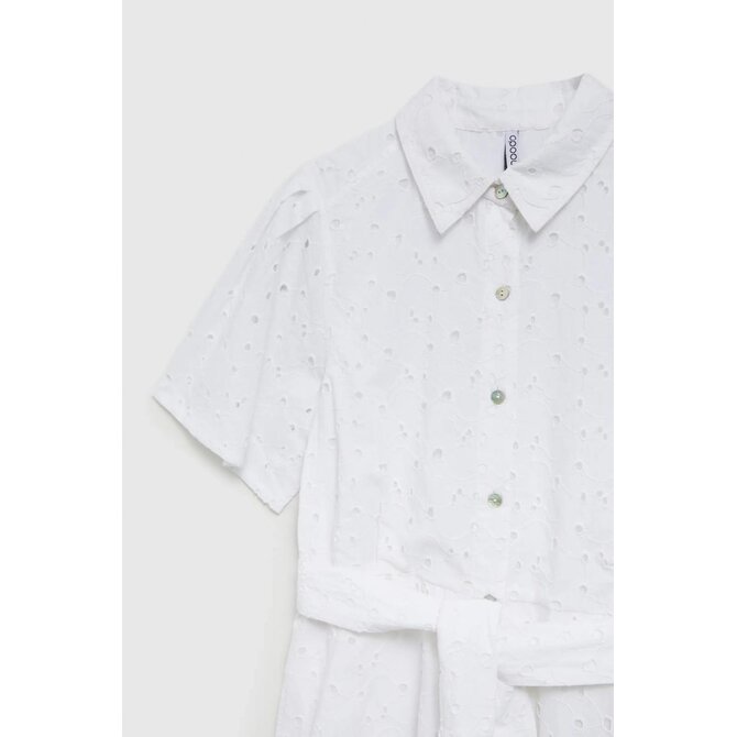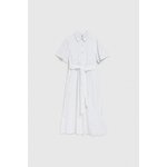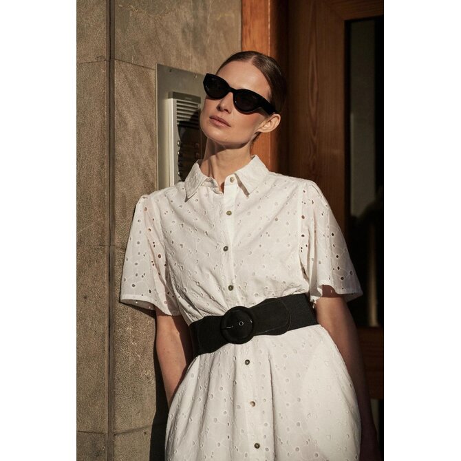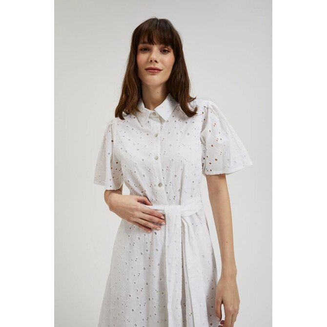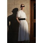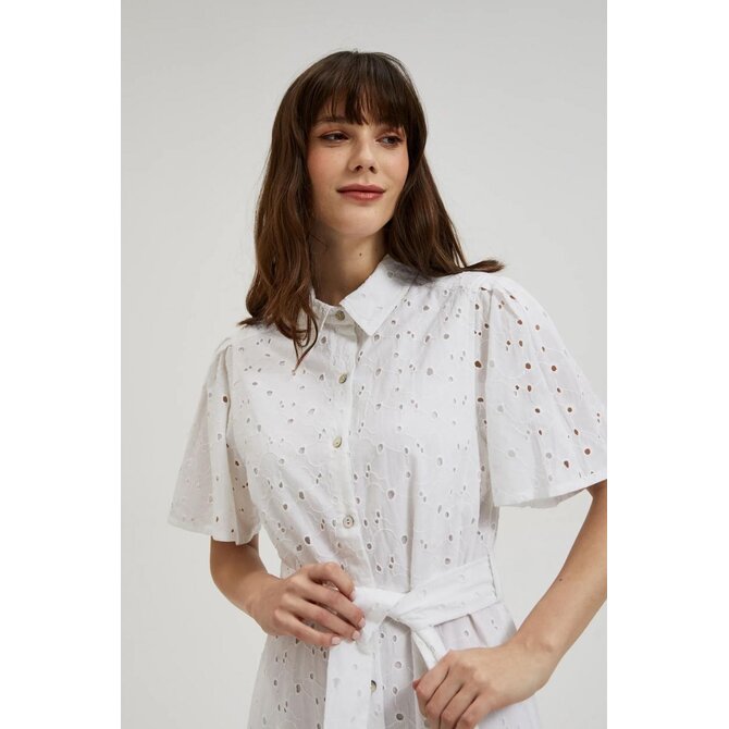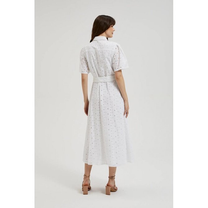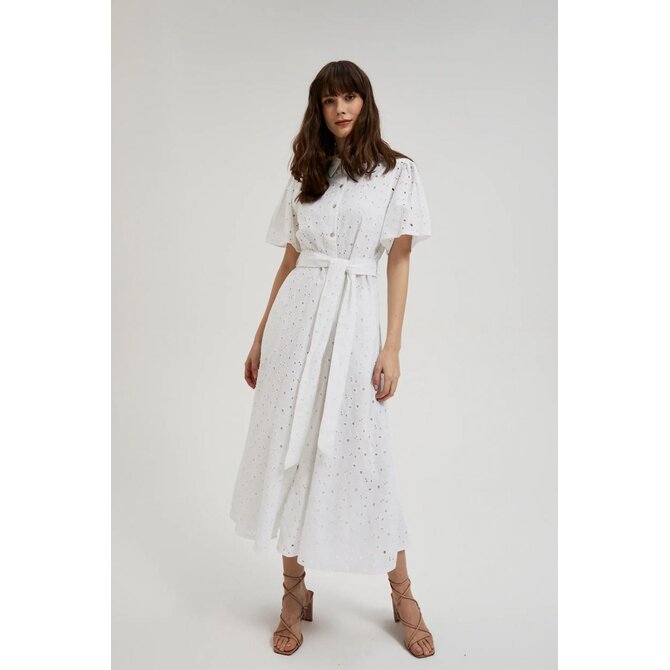 MATERIÁL 1: 100% BAVLNA, MATERIÁL 2: 100% POLYESTER Elegantní šaty v klasické bílé barvě s krátkým rukávem a rozšířeným střihem. Vyrobeno z vysoce kvalitní bavlny, která zajišťuje pohodlí při nošení. Dodatečný pásek zvýrazňuje pas a dodává ženské postavě jemnou siluetu. Šaty se zapínají na knoflíky, což jim dodává na originalitě. Tyto jedinečné midi šaty jsou ideální na letní párty, rande nebo setkání s přáteli. Dá se nosit jak každý den, tak i na formálnější příležitosti. Skvěle se bude hodit k sandálům na vysokém podpatku, plochým sandálům, ale i teniskám nebo balerínkám. Díky univerzálnímu střihu budou šaty dokonalým doplňkem vašeho letního šatníku.