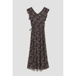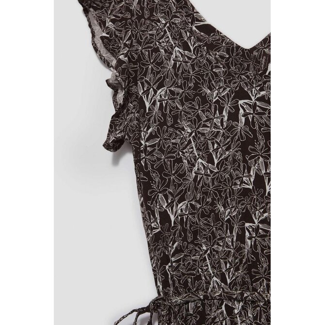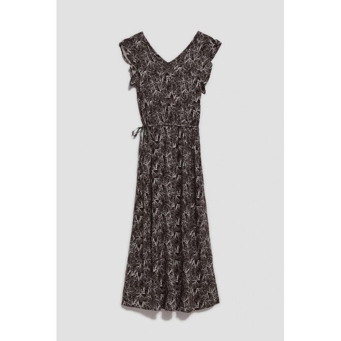 100% VISKÓZA Tmavě hnědé šaty v boho stylu. Všude jemný květinový vzor. Výstřih do V jemně odhalující krk. Krátké a široké rukávy s volánky. V pase všitá gumička umožňuje šaty upravit a přizpůsobit postavě a pásek pas dokonale zvýrazní. Velmi ženský střih, směrem dolů se rozšiřující, dodává eleganci a zajišťuje volnost pohybu. Délka ke kotníkům. Vyrobeno z viskózy, je měkké a jemné na dotek a zároveň vzdušné. Šaty se hodí na mnoho příležitostí i do práce.