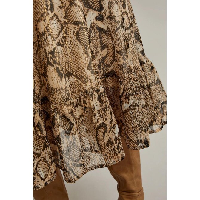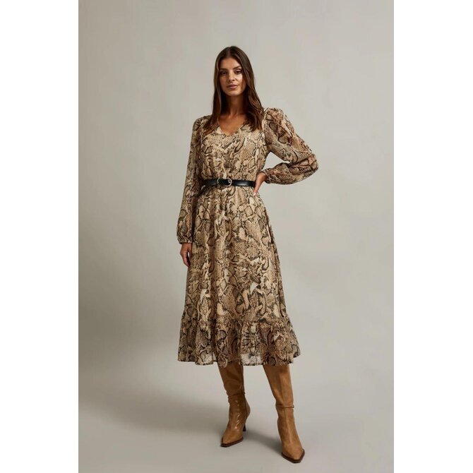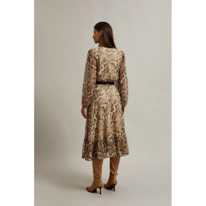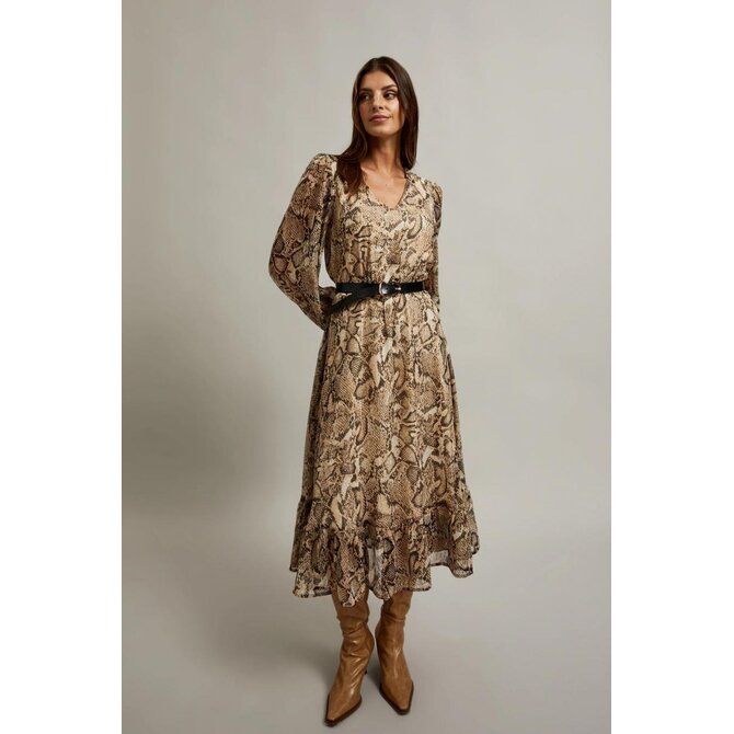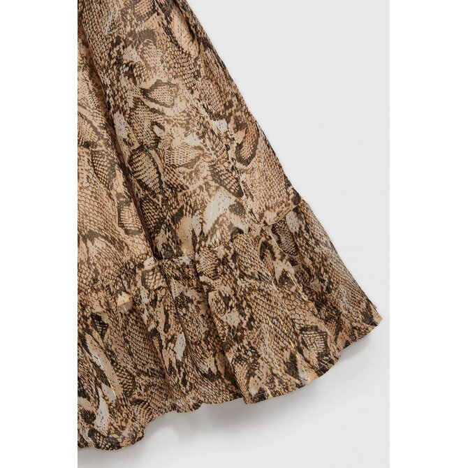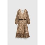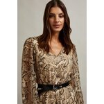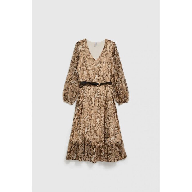 Béžové šaty zdobené zvířecím potiskem. Je vyrobena z polyesteru, má obláčky, podšívku, volány a nařasení. V pase je gumička. Jsou to klasické, elegantní šaty, ideální pro různé příležitosti - ležérní, pro speciální příležitost, do práce nebo na každý den. Šaty jsou rozšířené a výstřih do V. Délka šatů dosahuje do půli lýtek.